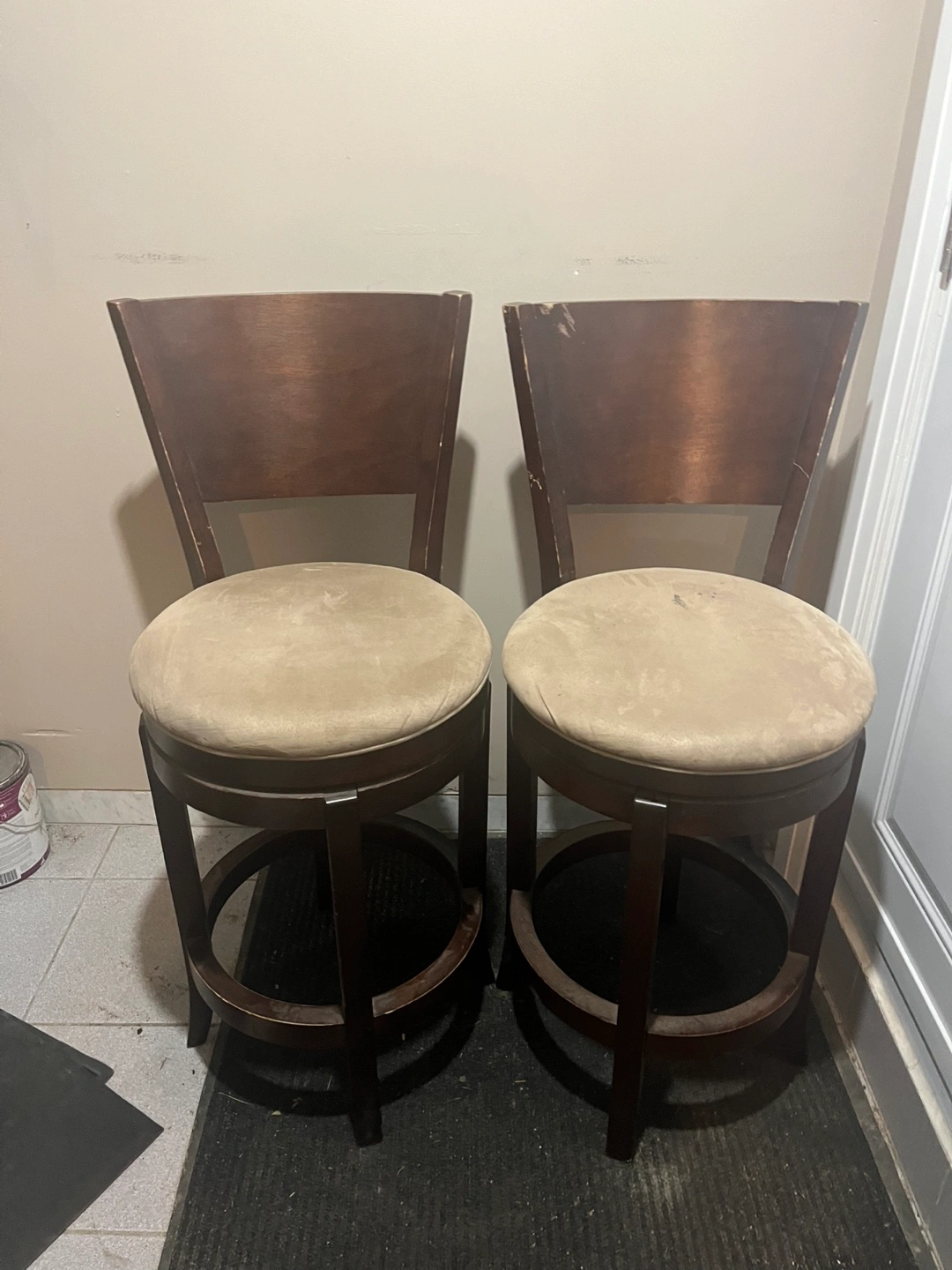 Selling two bar stools with a swivel feature. They have a brown wooden frame and a beige seat. There are some signs of wear and tear on the top of the backrests, as shown in the pictures
