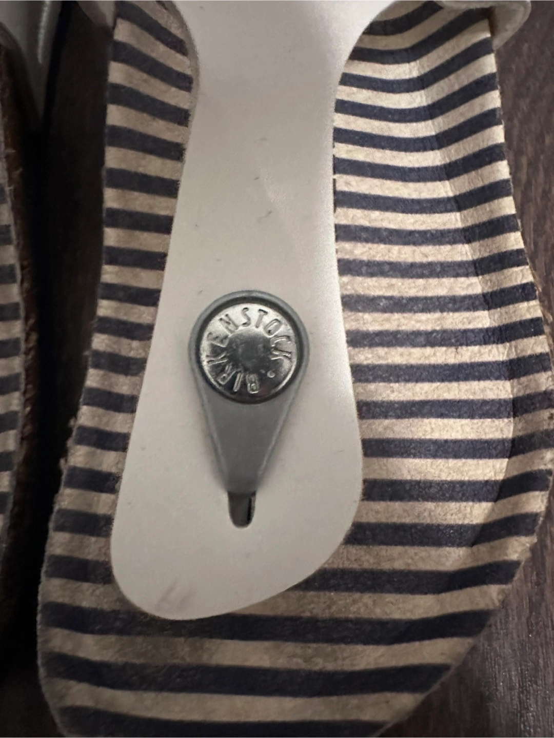 Kids Birkenstock Gizeh sandals in a white and navy stripe pattern! These are size EUR 31 (US 13.5). They are in great condition and ready for a new home.