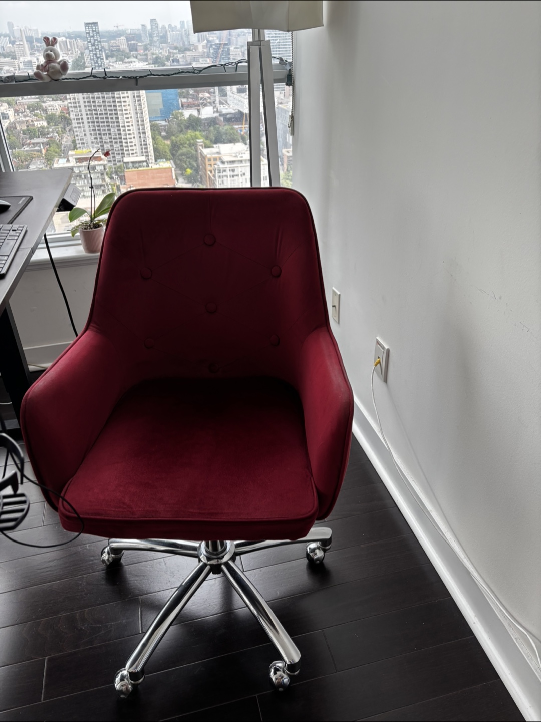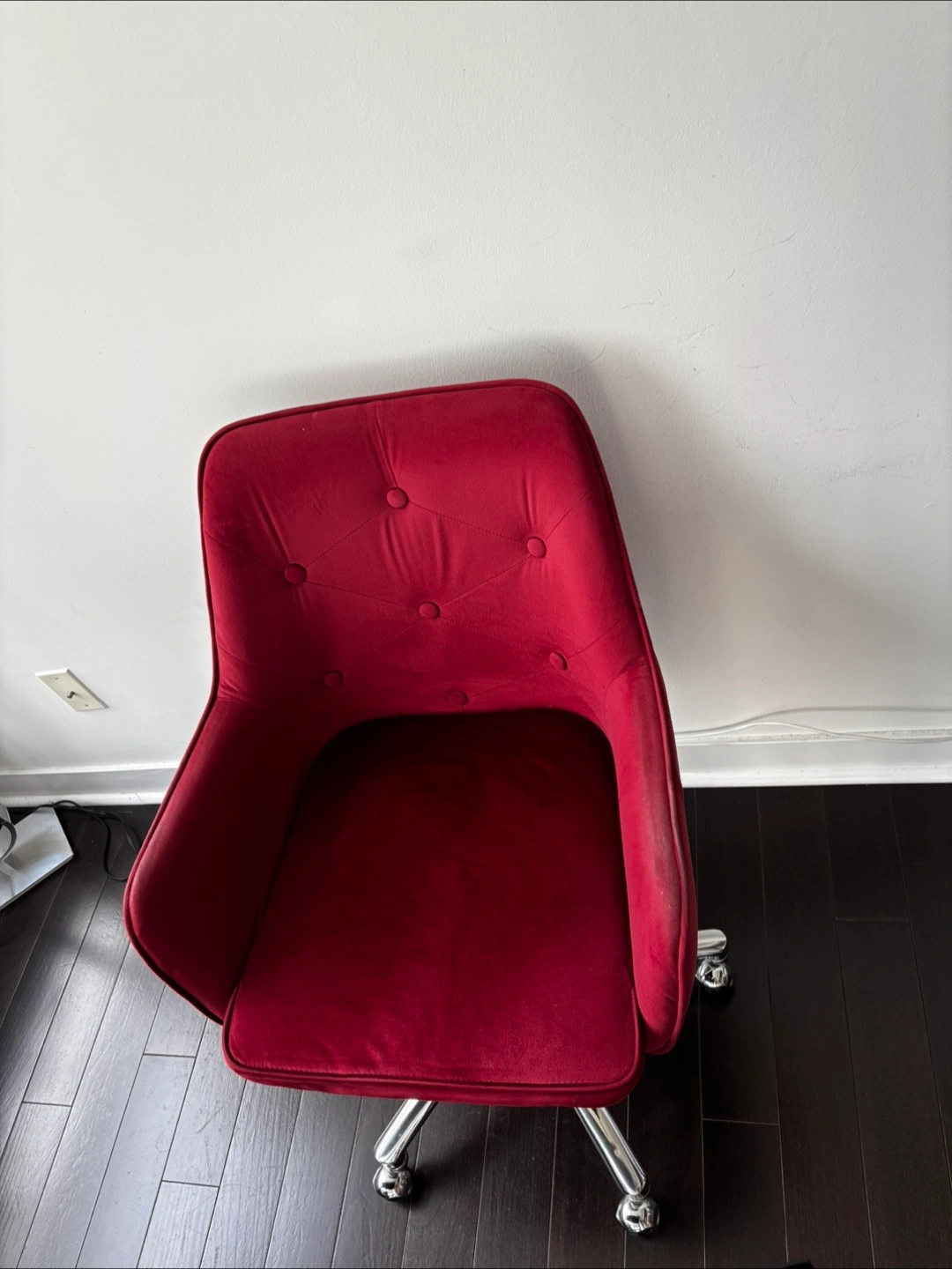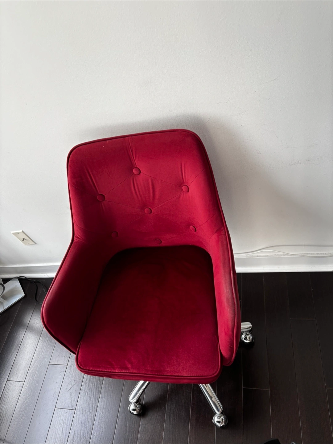 Selling a comfy red velvet office chair! It's perfect for adding a pop of colour to your workspace. The chair has a chrome base and is in good condition. Great for working from home or studying!