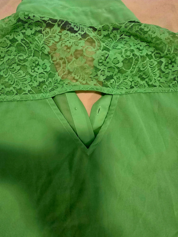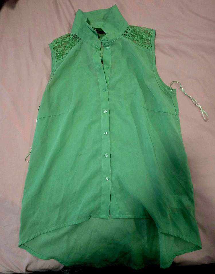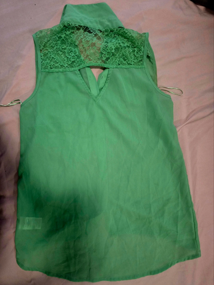 A lovely green sleeveless blouse with some really nice lace detailing on the upper back and collar! It's a button-up style and would look great for a night out or even just a casual day.