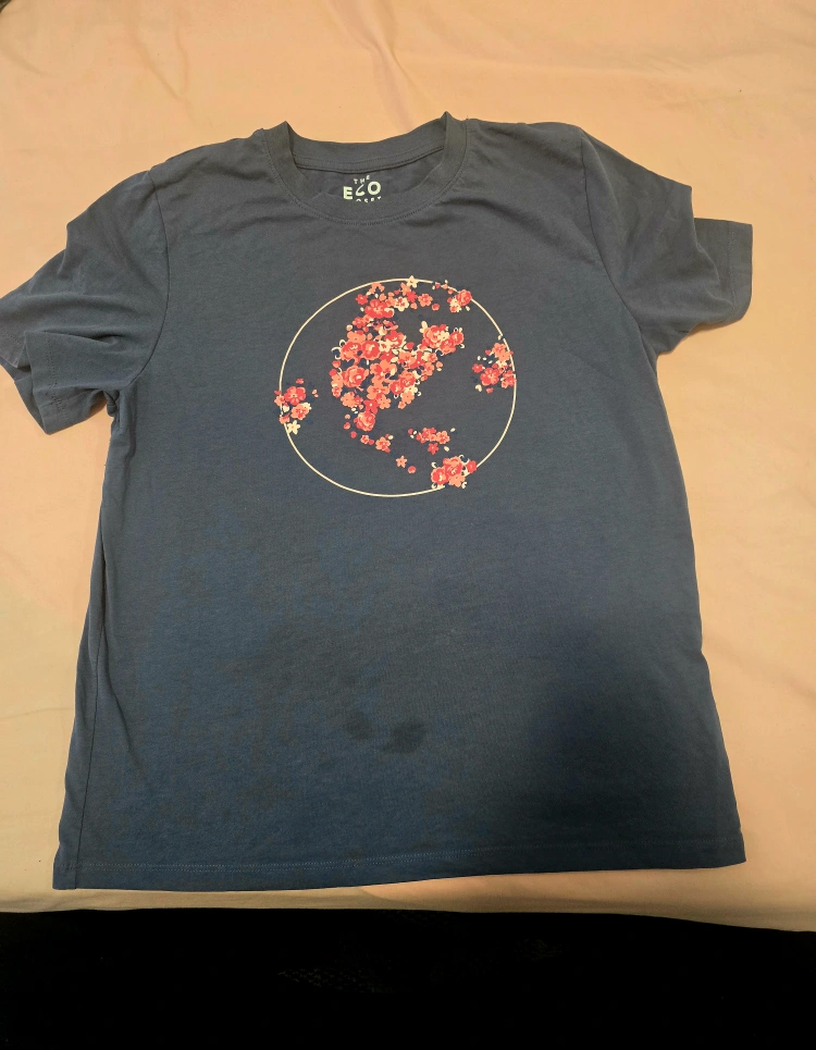 A blue t-shirt from The Eco Grocery. It has a floral design on the front. There are some marks on the front of the shirt.