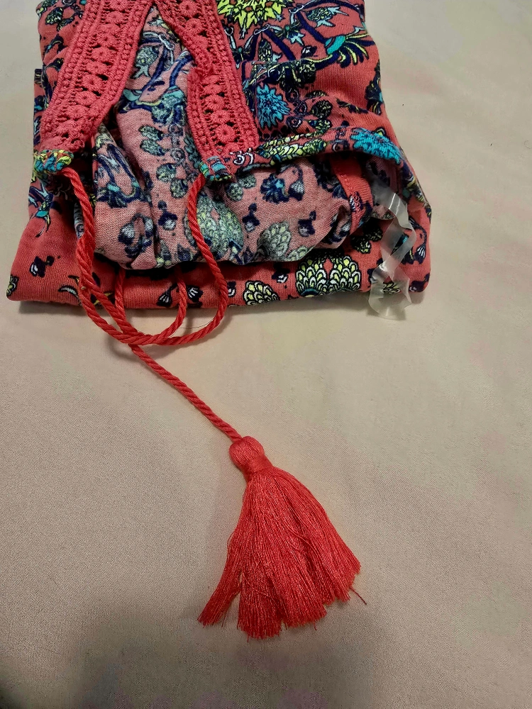 Coral tank top with a vibrant floral pattern. It's in great condition and ready for a new home! The top features a racerback design and a tassel detail at the neckline. Perfect for a casual summer look!