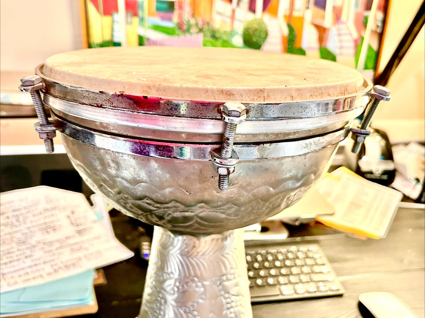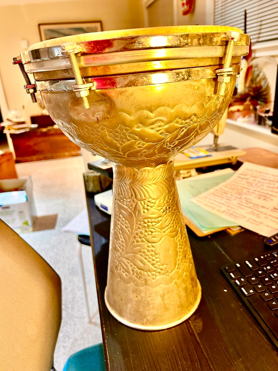 Tun-able Doumbek of highly polished silver metal with engraved designs in excellent condition. Very deep and bright tones. Light weight. Measured 14 1/2” tall with 10 1/2” head.