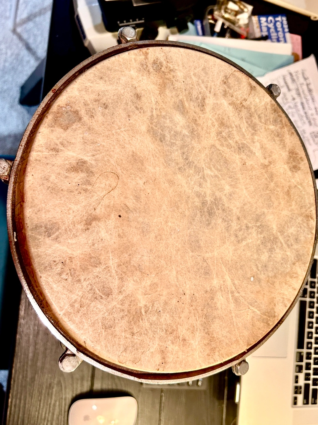 The skin is in excellent condition. Recently tuned. Very loud nice sounding drum that resonates well. Lightweight and very portable.