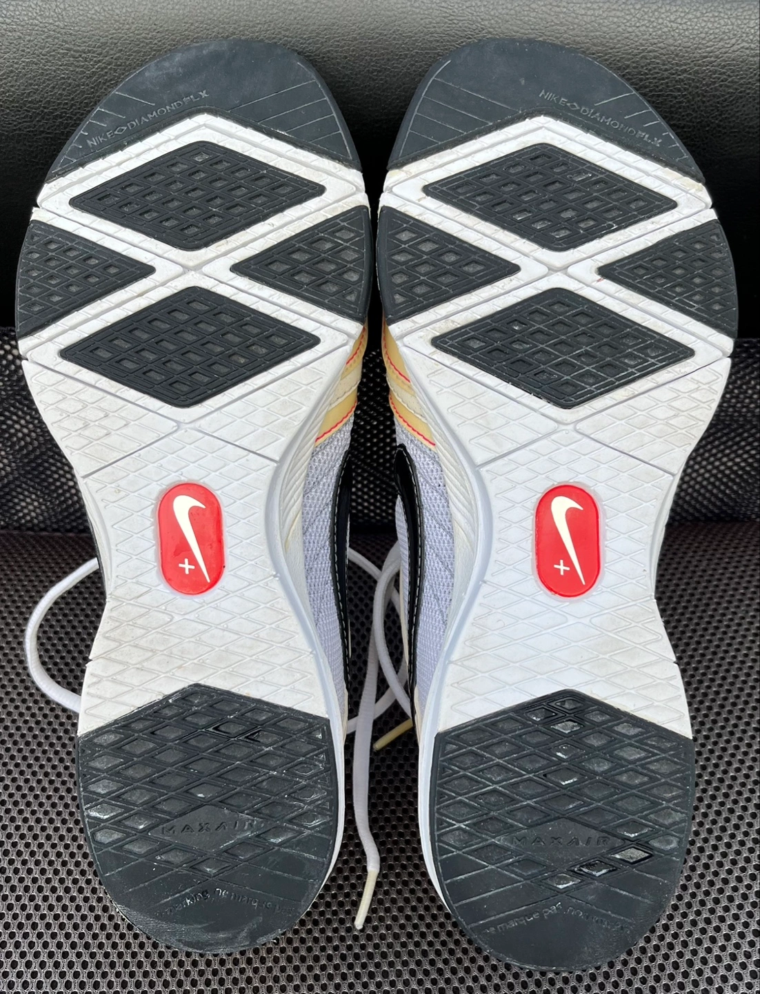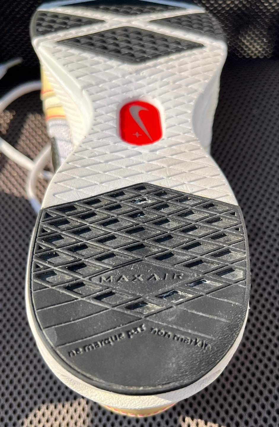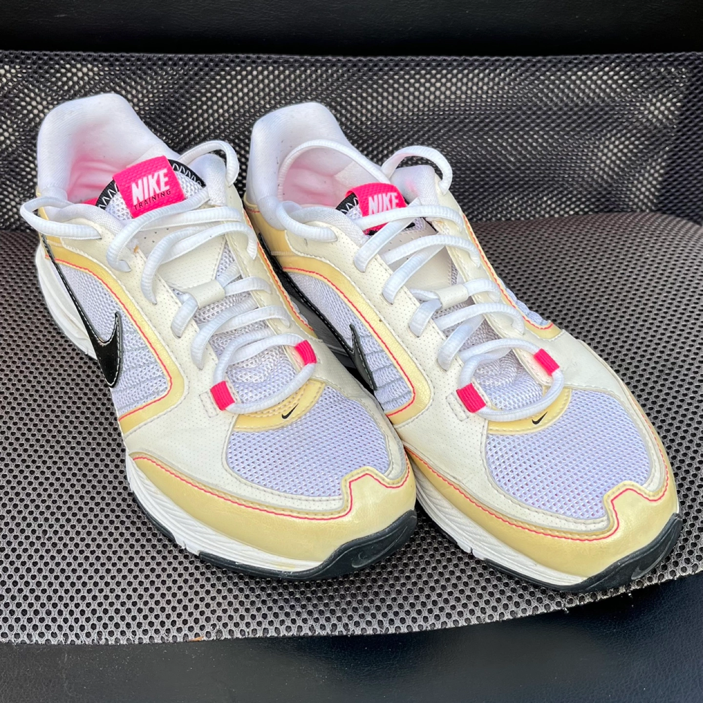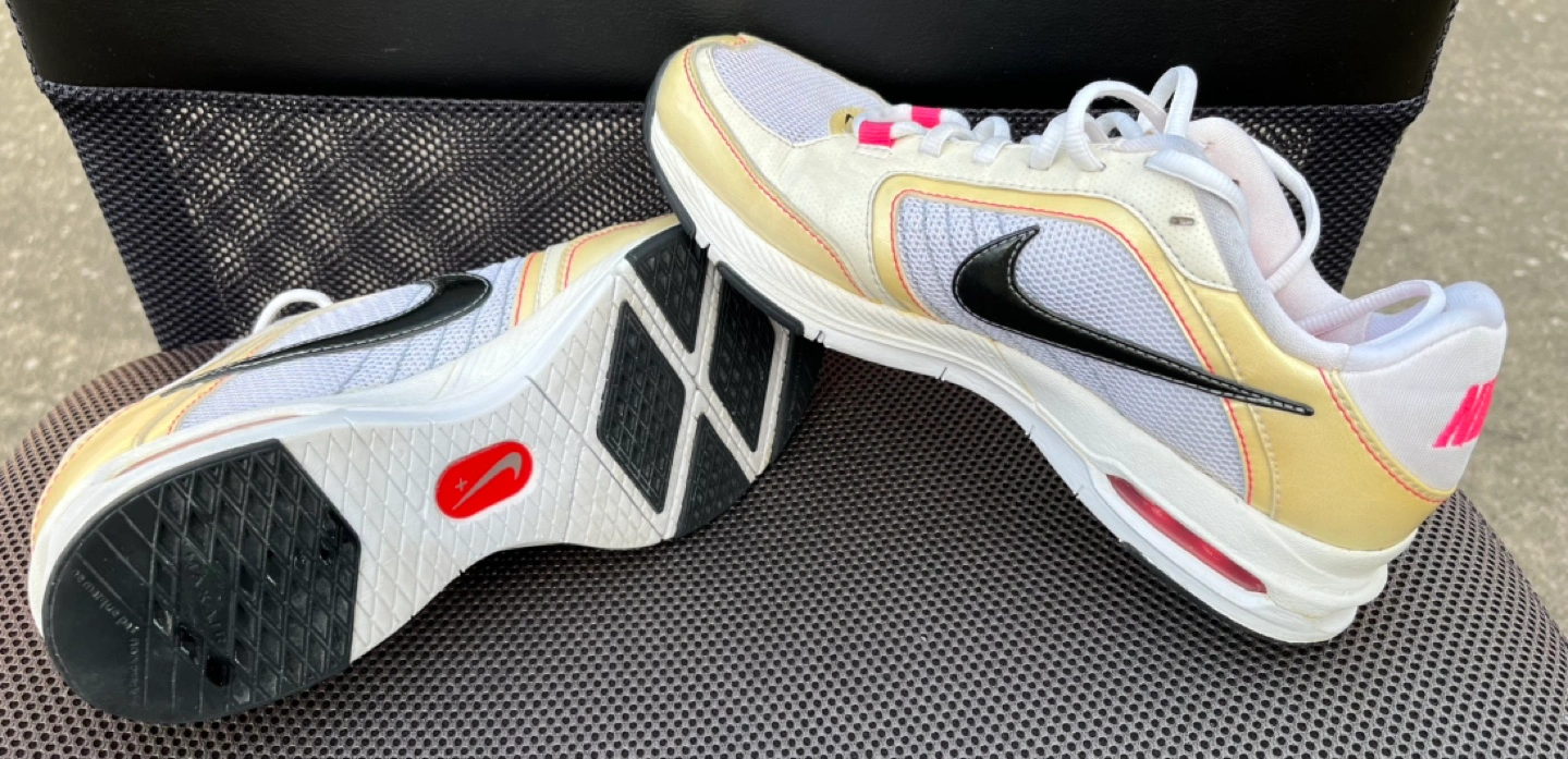 This is the second pair of shoes my wife wants to sell that I want her to keep. I told her these shoes have a lot of life left in them and the laces are even bright white! She is quite adamant, so to save an argument, here are some gently used trainers. The Max Air units are still full with a nice and quite rare 180 side and rear view of them which is a good sign of not a lot of wear/use, nicely stitched gloss black Swoosh, beautiful white and pearl gold colorway with a touch of pink, non-marking outsole, soft canvas and mesh. 360 degrees clean. Wife bought them because they’re “cute”. I would buy them because of yoga, the gym, long walks, running. But that’s just me. Size 7.5.