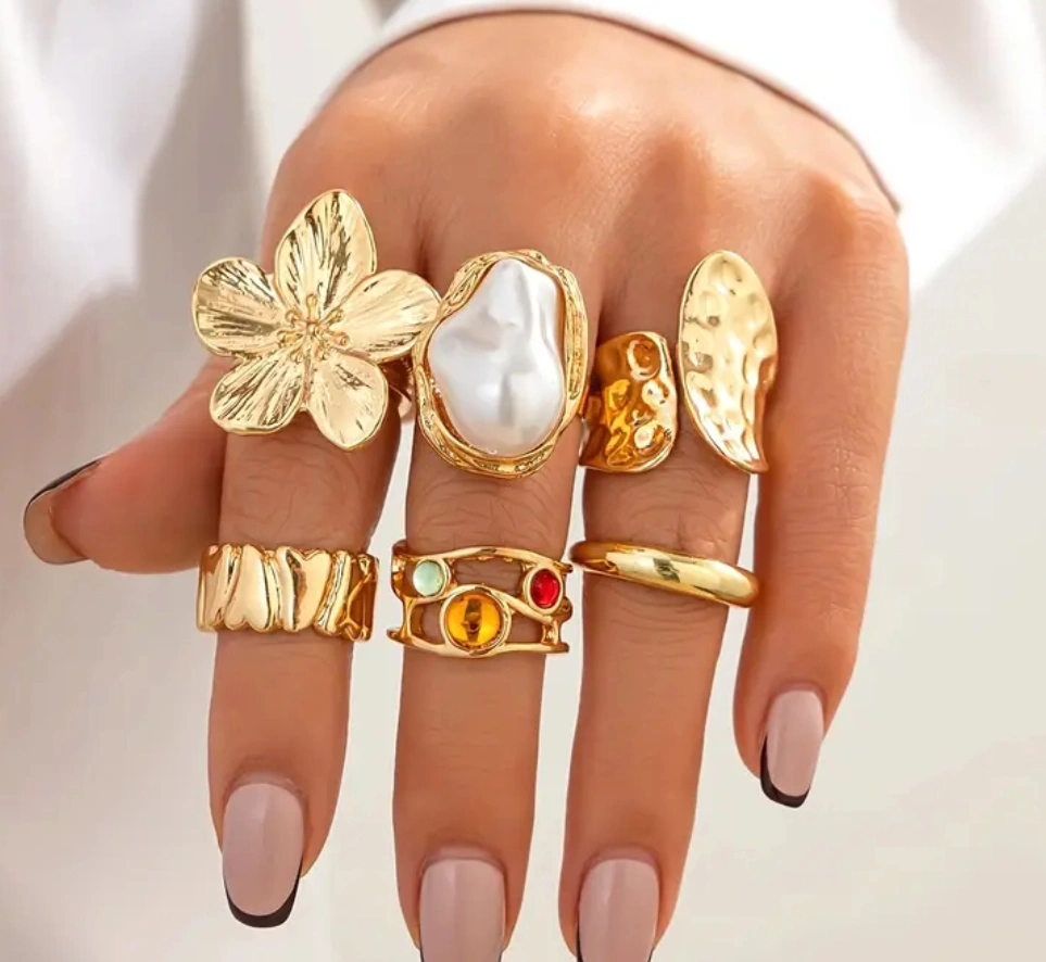 85Selling a set of gold-tone rings with different designs! The set includes rings with a flower, faux pearl, hammered texture, and more. Perfect for adding some flair to any outfit