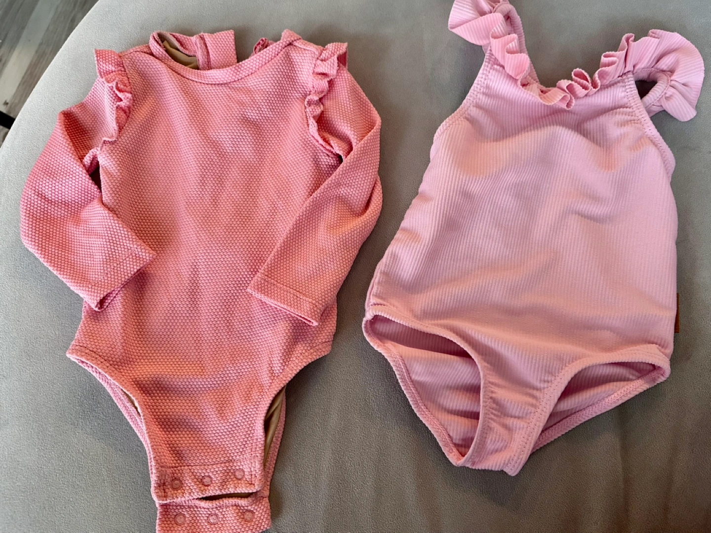 Two adorable pink baby swimsuits! One is a long-sleeved bodysuit style, and the other is a classic swimsuit style with ruffled straps. Perfect for your little one's swim adventures. Take them both for $10! Pet and smoke free home