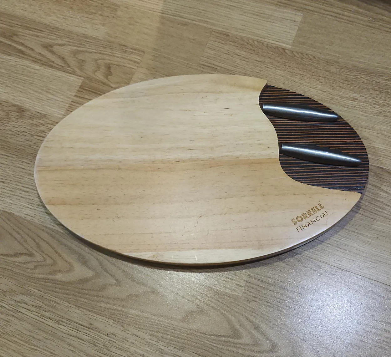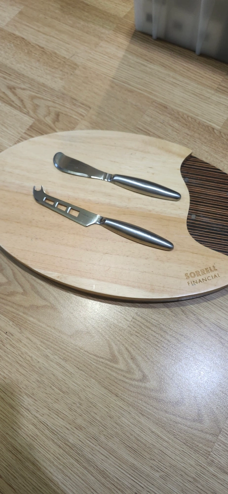 Cheese board with two knives. The board is made of light wood with a dark wood accent. The knives have silver handles. Great for entertaining! . price only cash only pickup no delivery. meet up on 801 O'Connor drive East York outside TD Canada Trust bank door.
