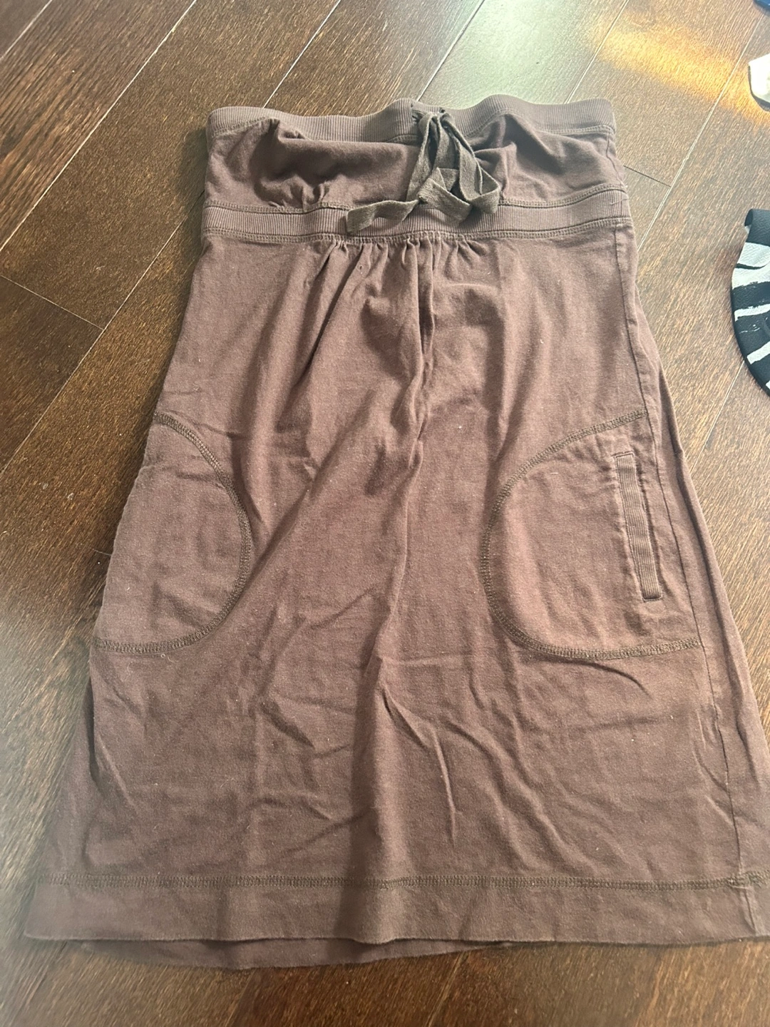 Cute brown strapless skirt! It features a drawstring at the top and two front pockets. Perfect for a casual summer day!