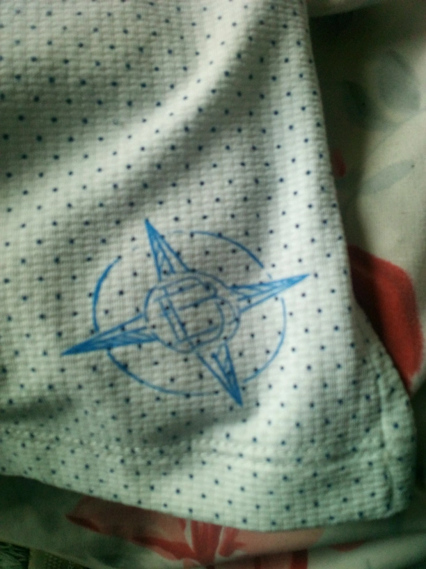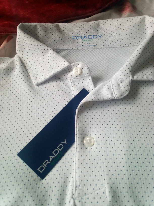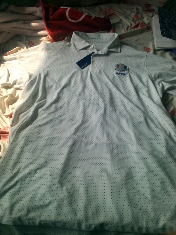 Selling a Draddy polo shirt featuring the Ryder Cup Bethpage Black logo. It's a stylish polo with a subtle dotted pattern. The shirt also has a compass design on the sleeve
