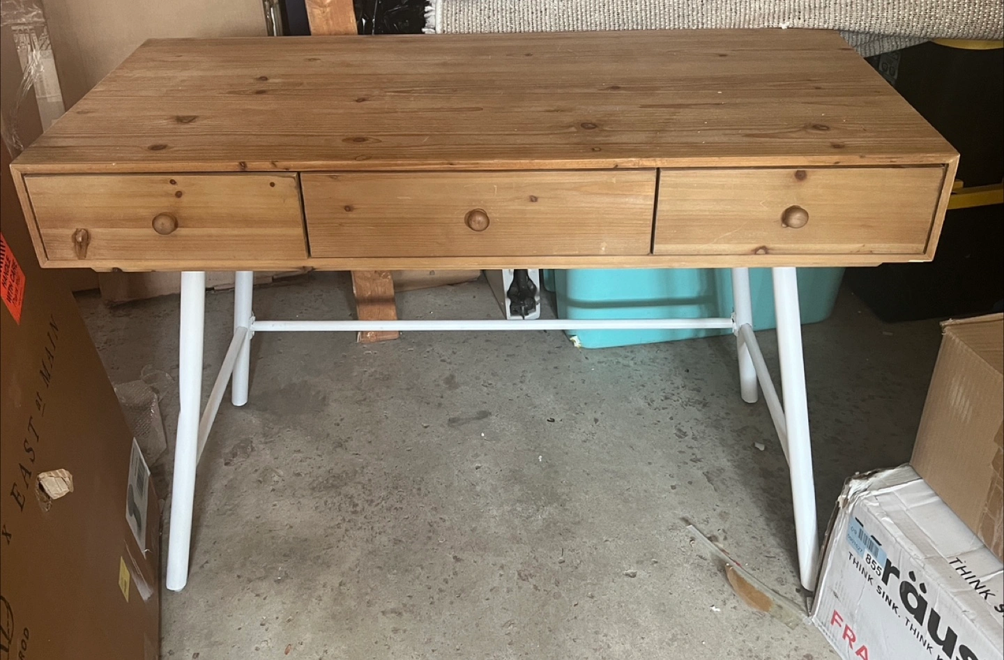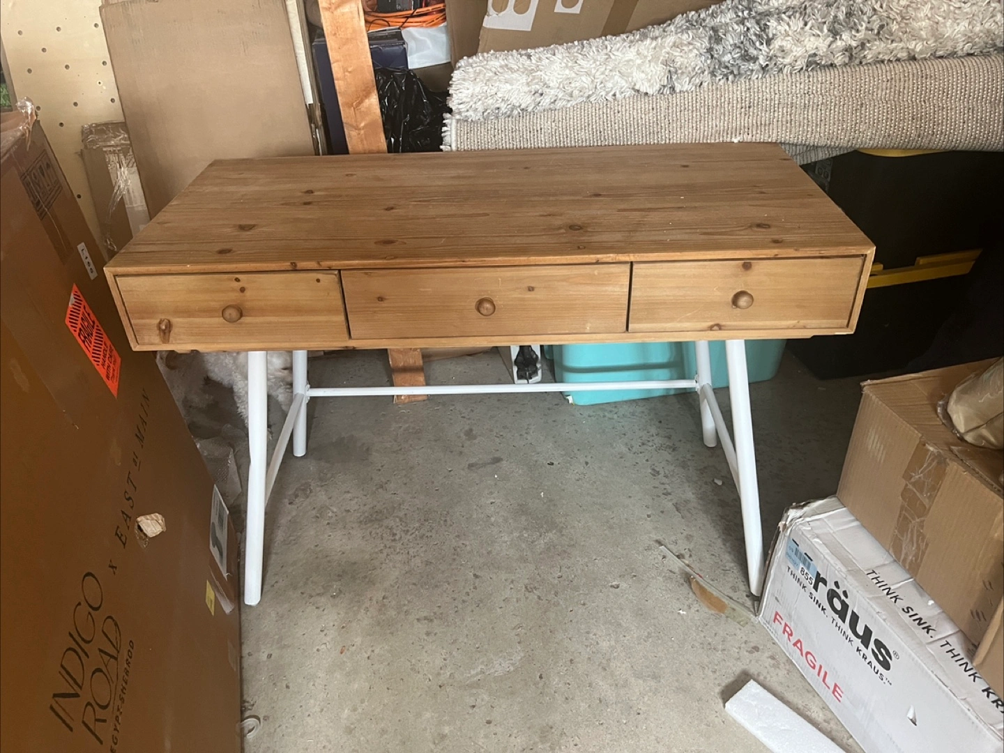 A charming wooden desk featuring three drawers and supported by white legs. It's a great piece for a home office or study area. The desk shows some signs of use, but it's still in good condition and ready for a new home