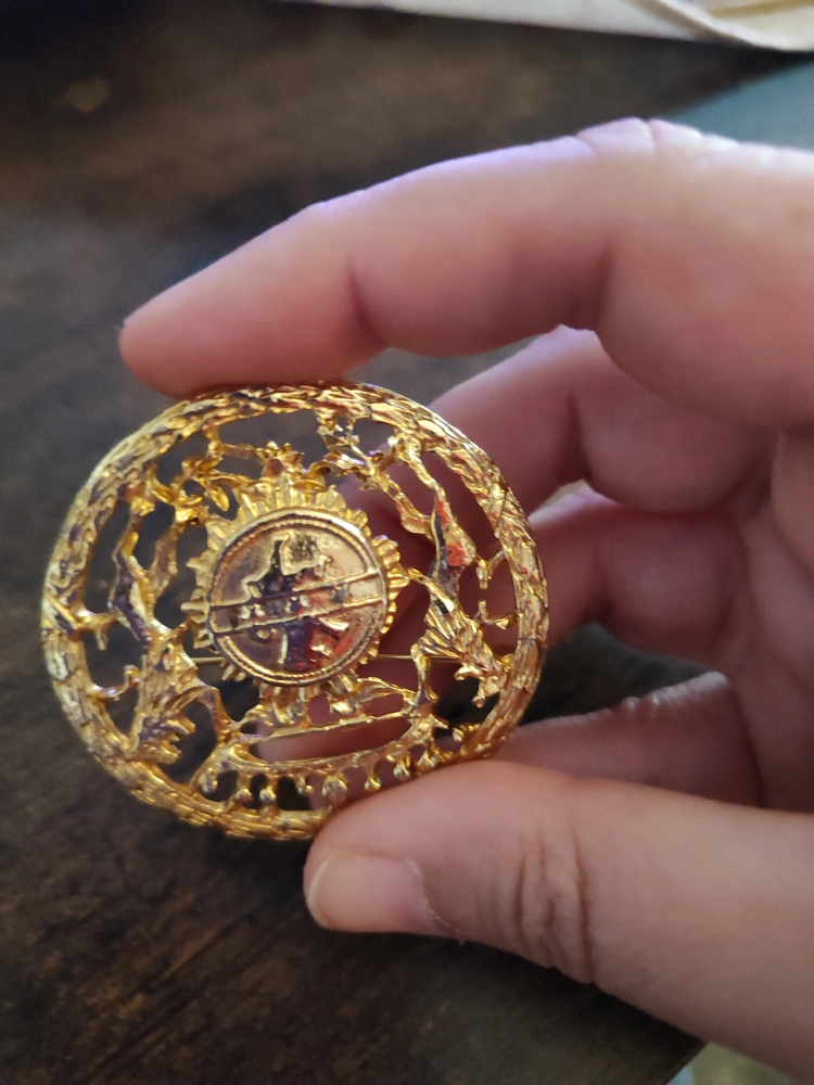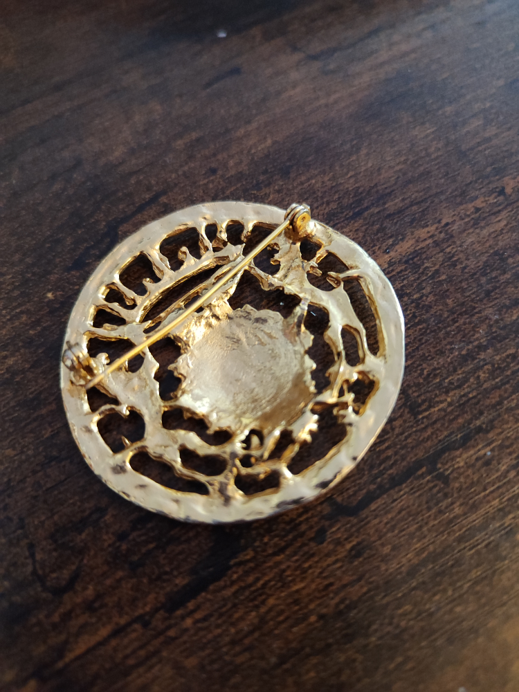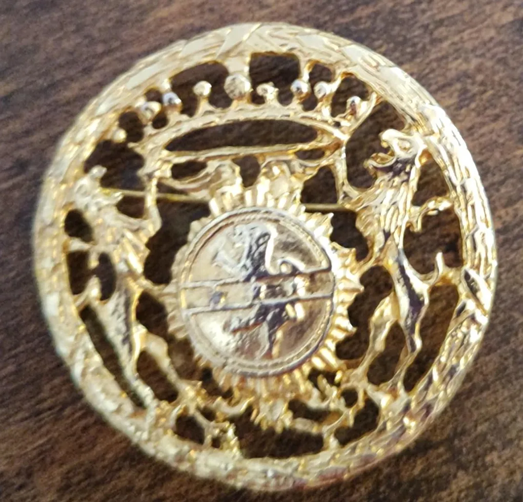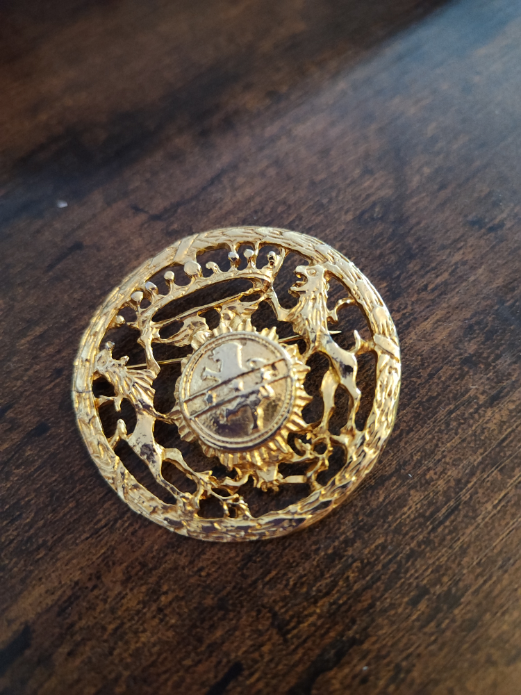 Selling a vintage gold tone brooch. It has an intricate design featuring lions surrounding a central emblem. The brooch is in good condition and would make a lovely addition to any collection!