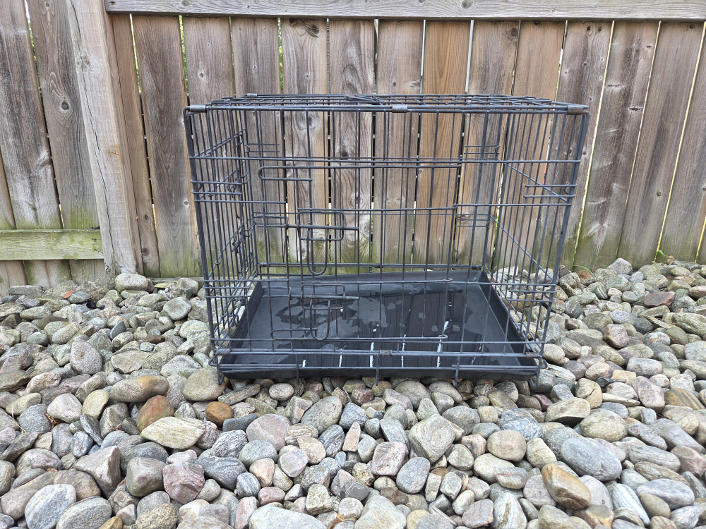 Selling a used dog crate in black. It's in good condition and ready for a new furry friend. Perfect for training or providing a safe space for your dog