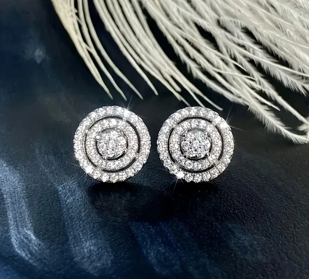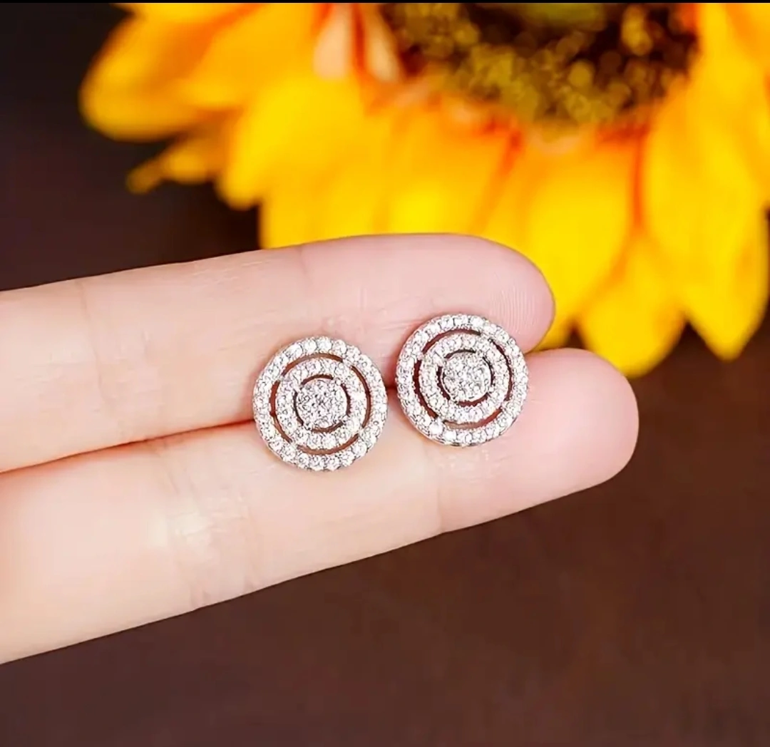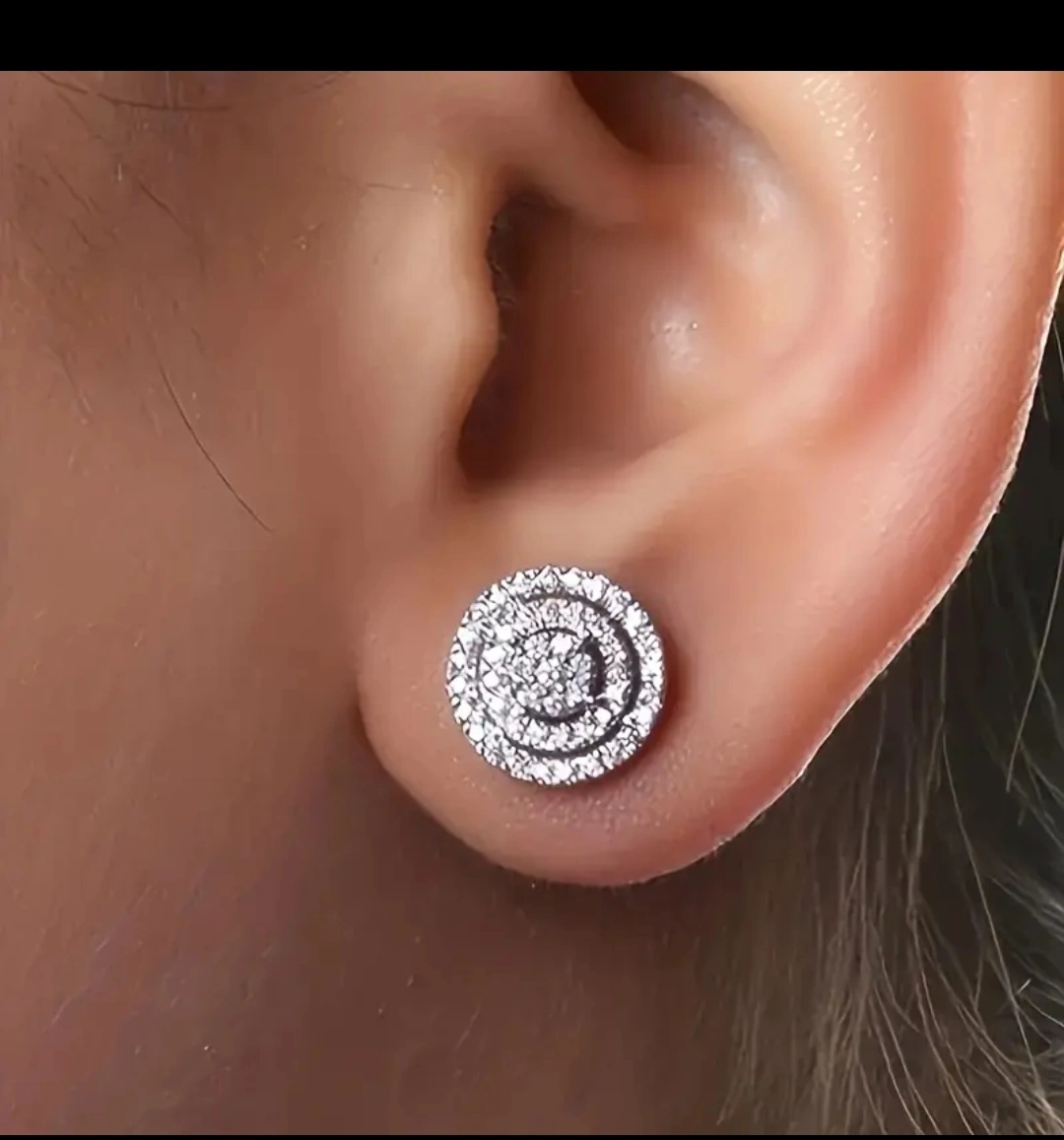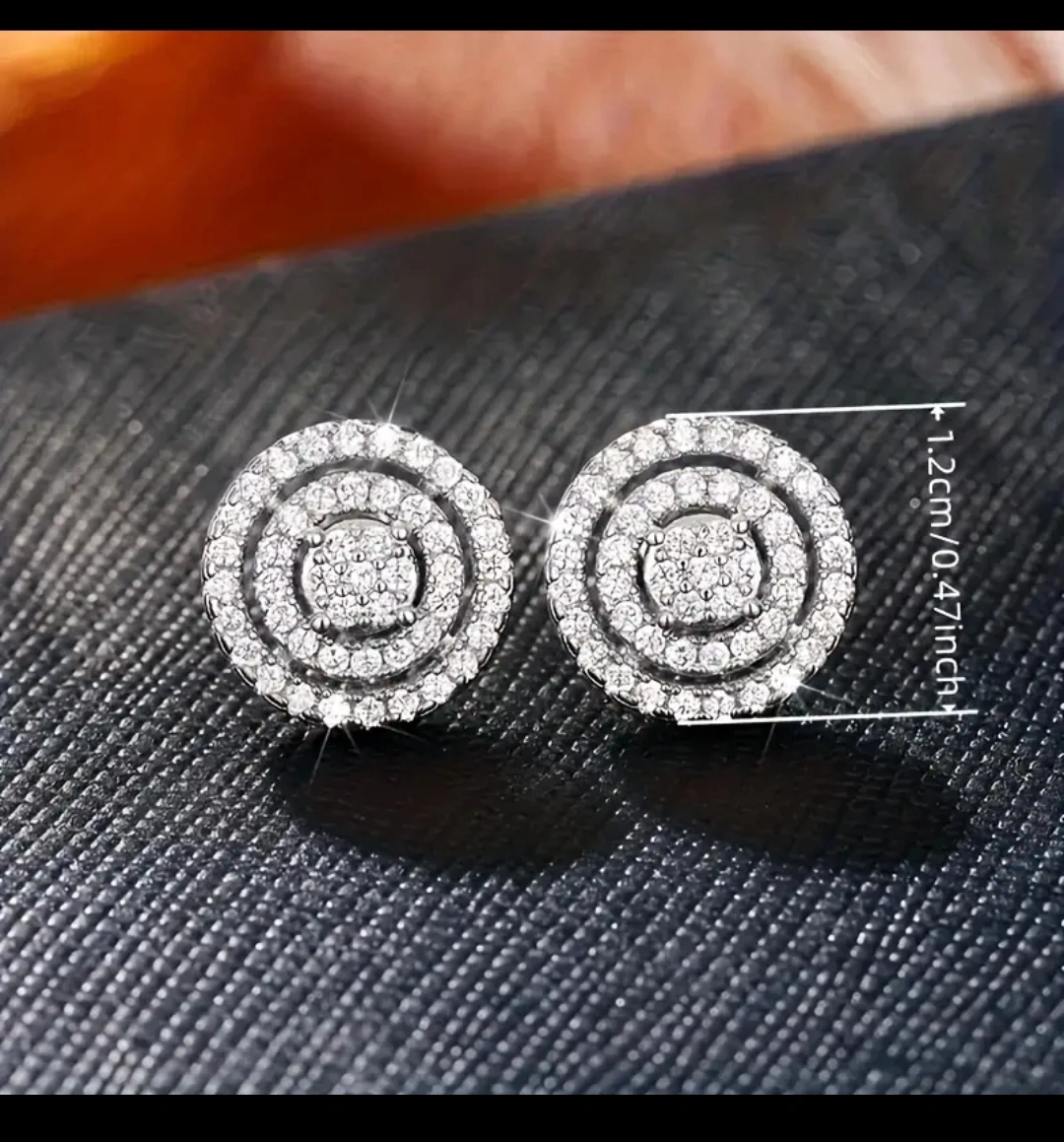 These are a pair of silver-coloured stud earrings. They have a round shape, and the diameter is about 0.47 inches. They would be a great addition to any jewelry collection!