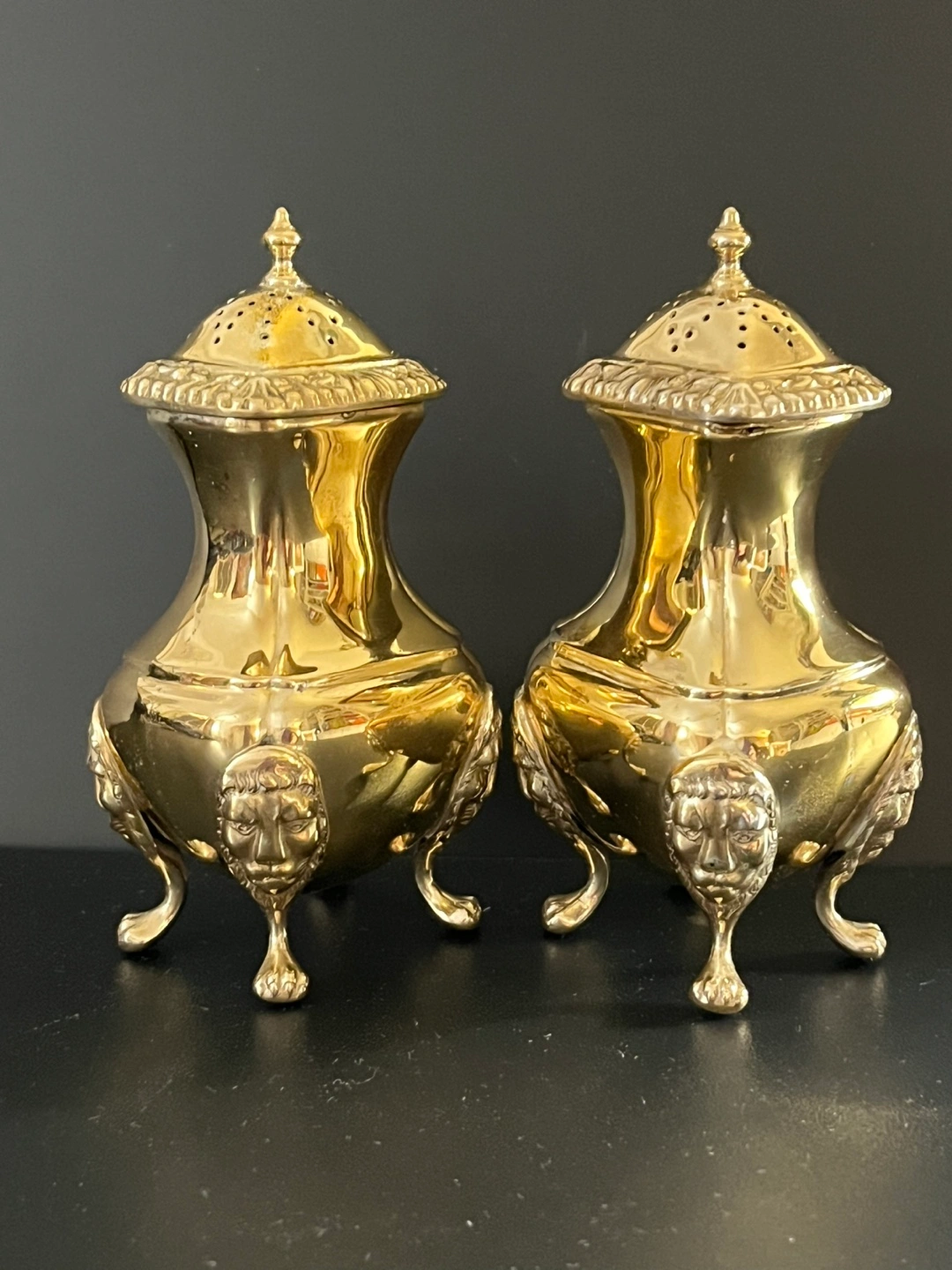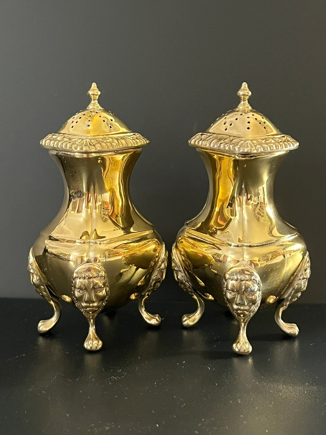 Here are a pair of vintage salt and pepper shakers. They have a unique design with lion head details on the legs. These shakers would add a touch of elegance to any dining table