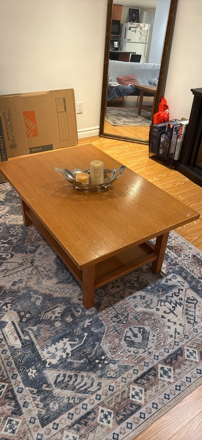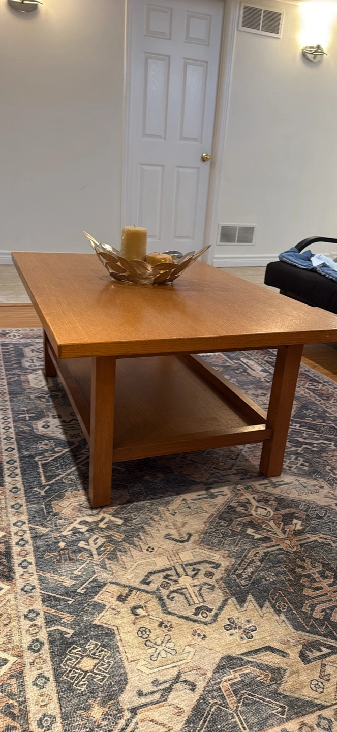 A lovely wooden coffee table with a shelf underneath for extra storage! It's in good condition and would look great in any living room. Perfect for your coffee, books, or decor