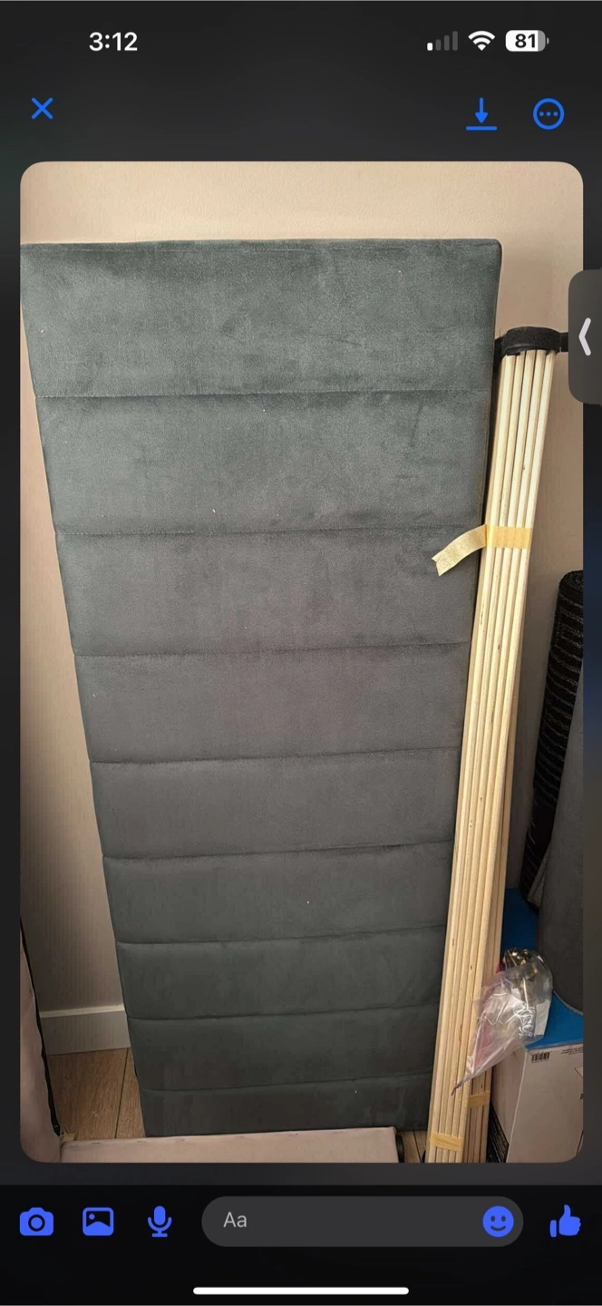 Selling a Molblly full-size bed frame in dark green! It features an upholstered headboard and a platform design, so no box spring is needed. It's easy to assemble and provides under-bed storage. The dimensions are 77" x 54" with a 42" headboard height. It can support up to 800 lbs