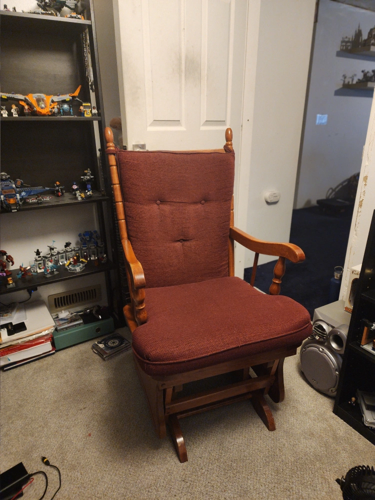 Selling a comfortable gliding rocking chair. It's in good condition and perfect for relaxing. The chair features a sturdy wooden frame and a soft, padded seat and backrest in a nice burgundy colour. It would be a great addition to any living room or nursery