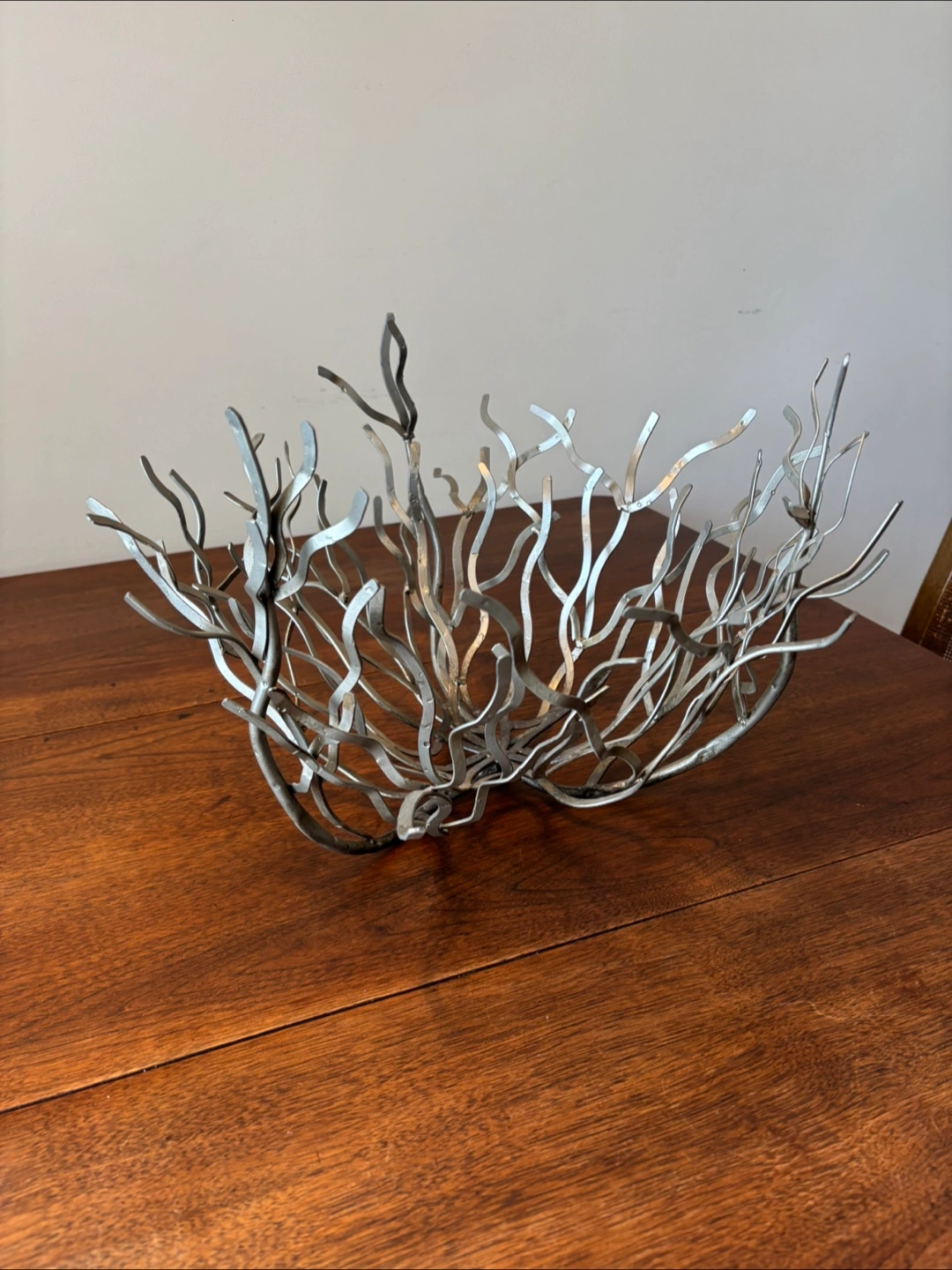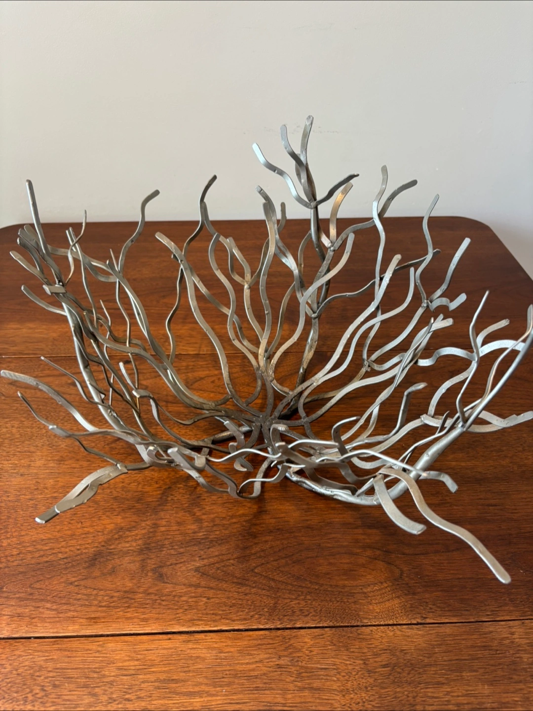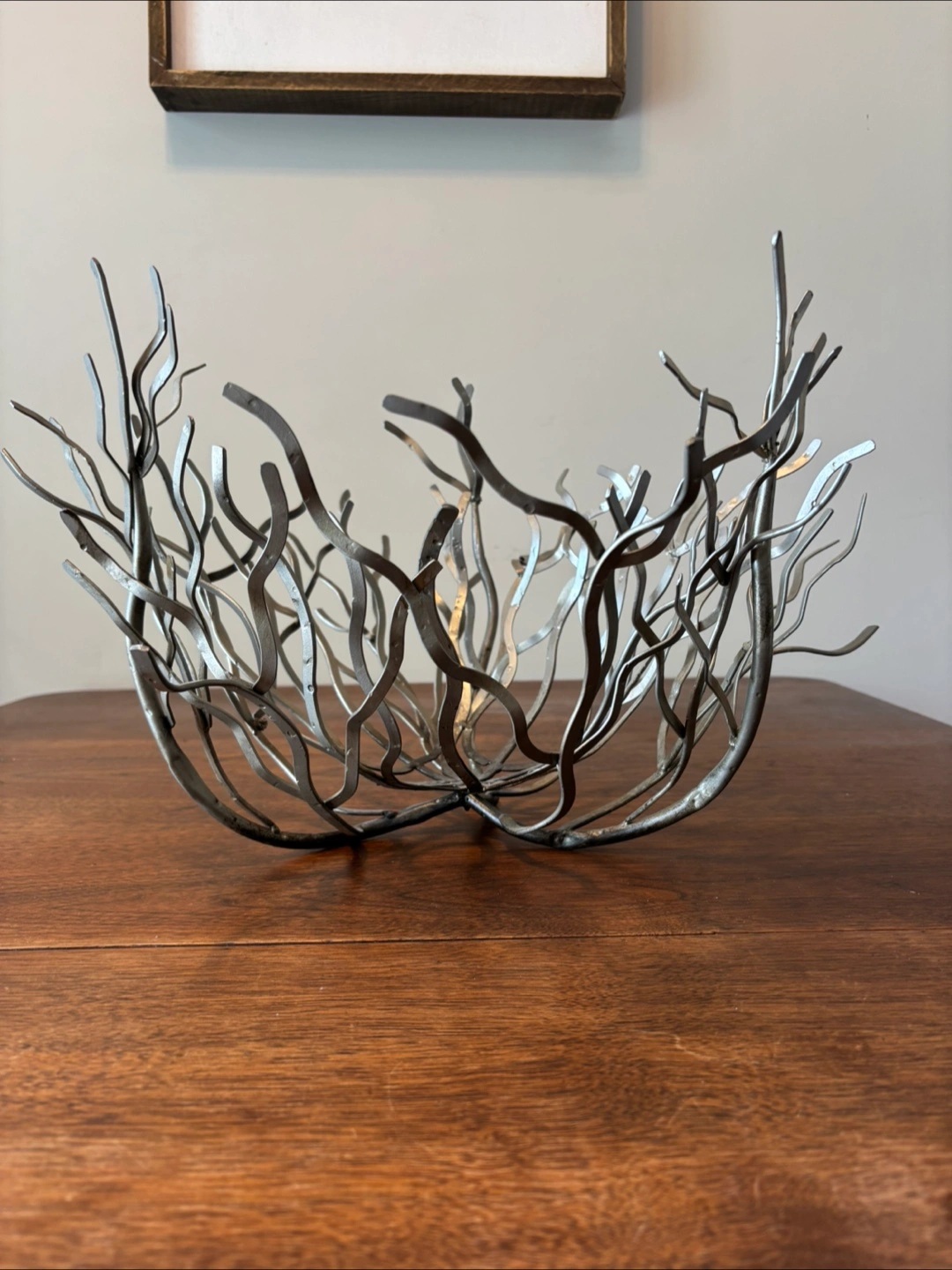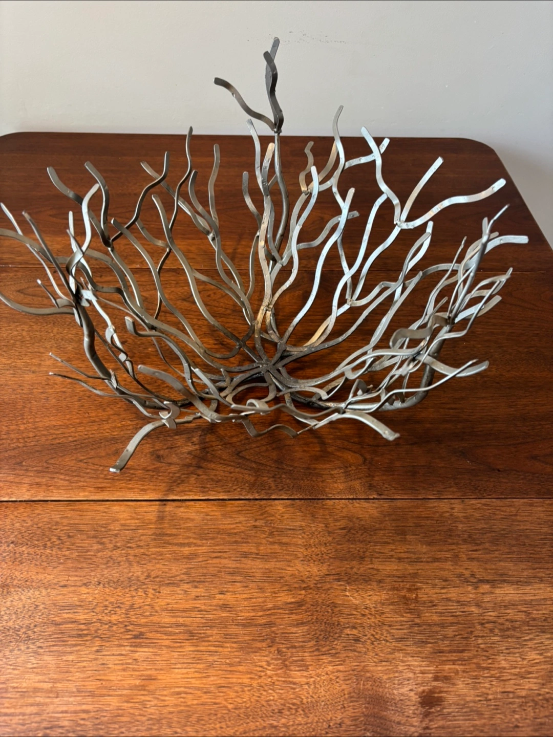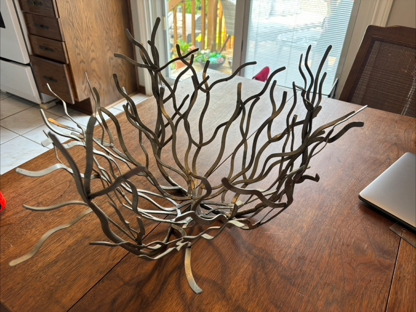 This is a unique metal decorative bowl that would look great as a centerpiece or accent piece in your home. It's in good condition and ready to find a new home! 11” tall and 17” wide. Cash only.