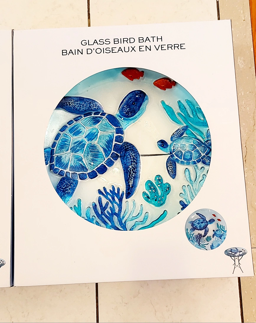 This particular bird bath has a sea turtle pattern and is made of glass.