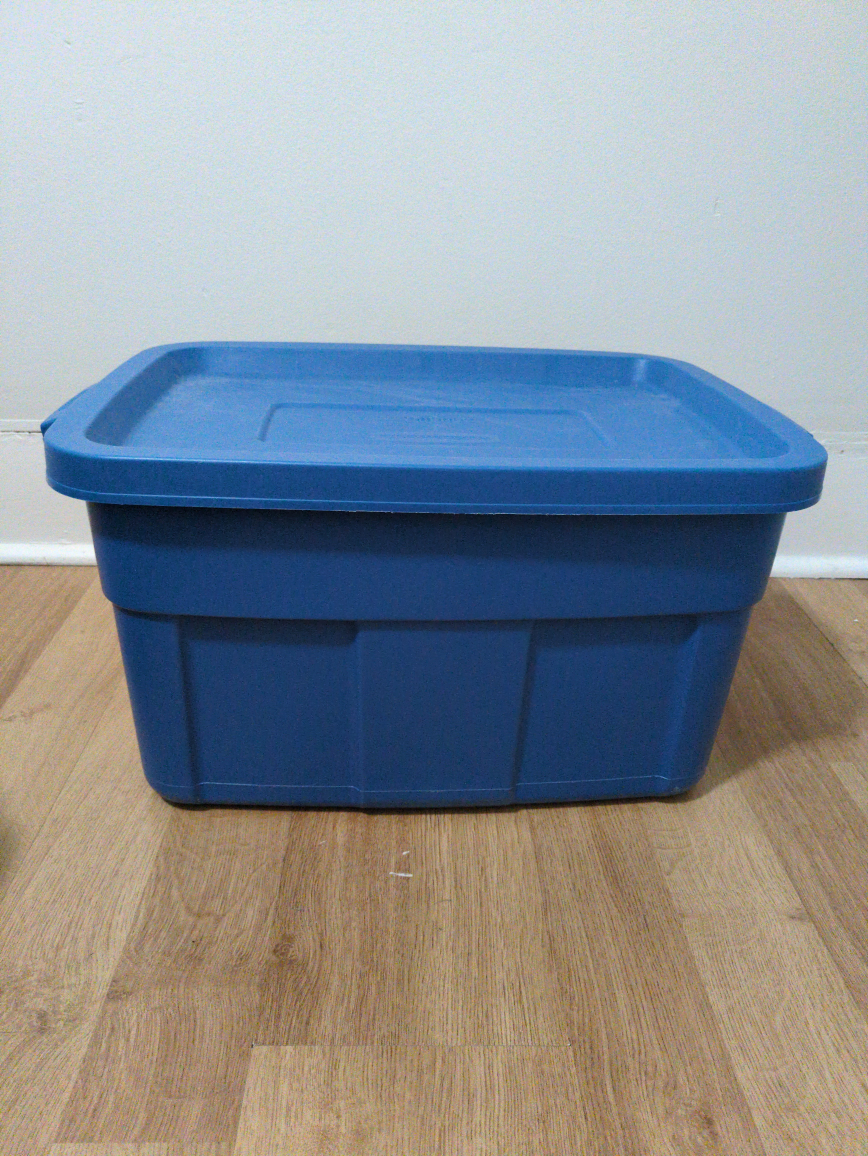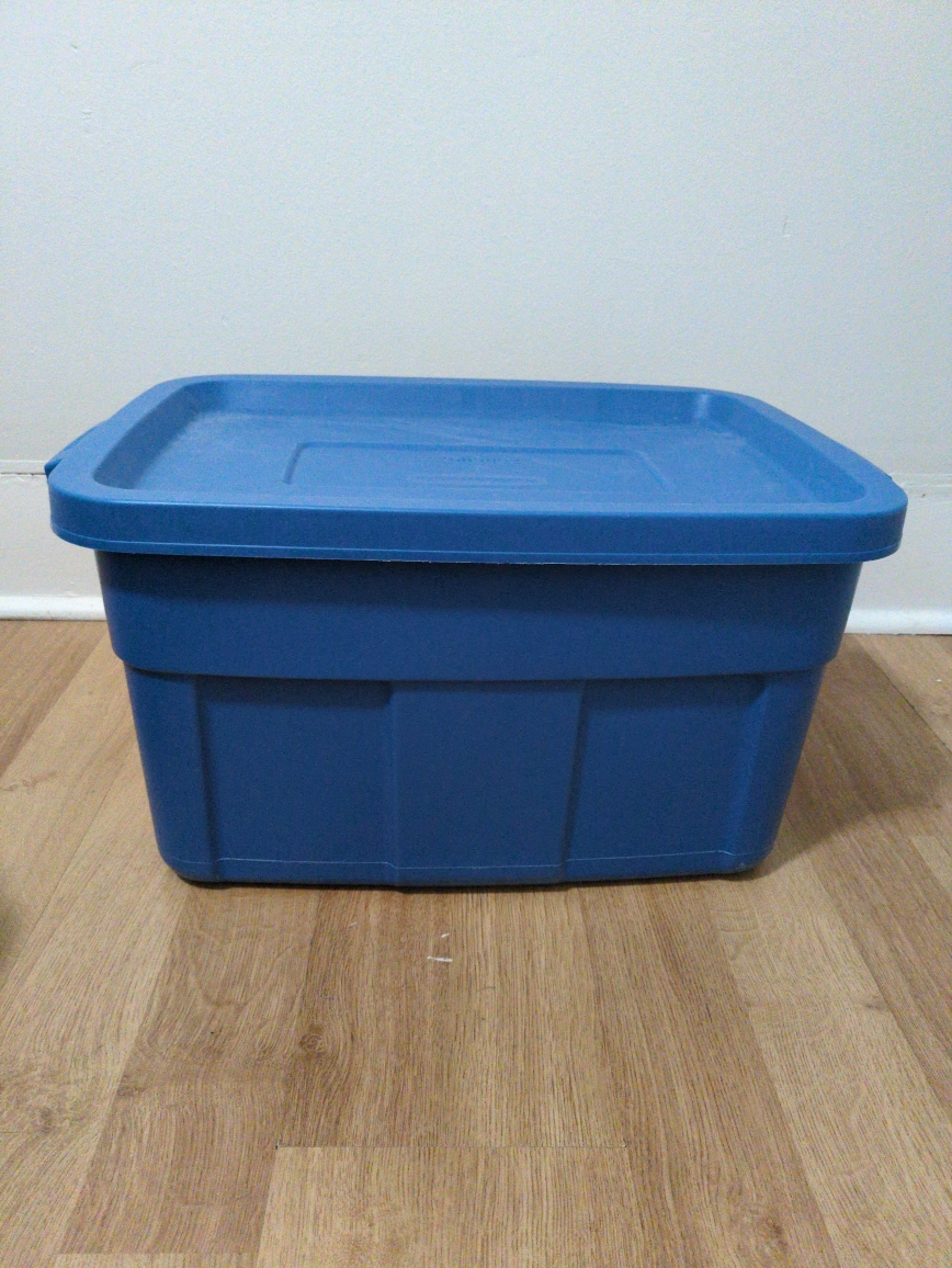 Selling a blue Rubbermaid Roughneck storage box. It's virtually indestructible and cold weather resistant! It The dimensions are 23.875 x 15.875 x 12.25 inches, or 60.64 x 40.32 x 31.12 cm, and the capacity is 53L / 14 Gal