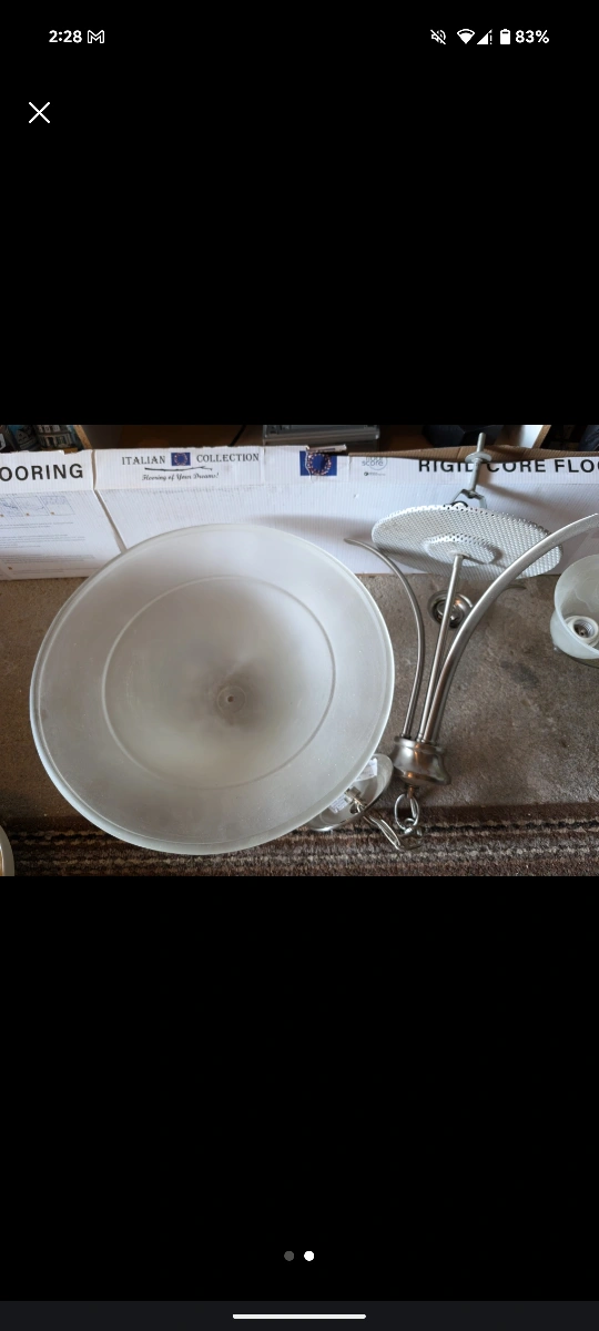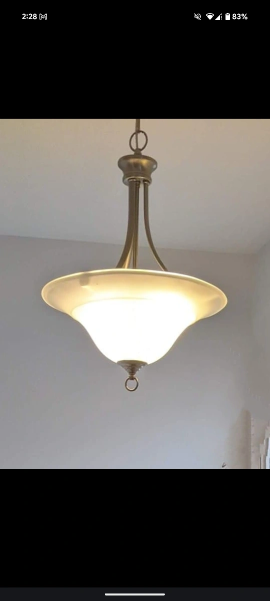 Chrome, frosted glass chandelier light fixture. Takes three bulbs, LED compatible. Comes with all hardware. Great working condition. 31 inches long.