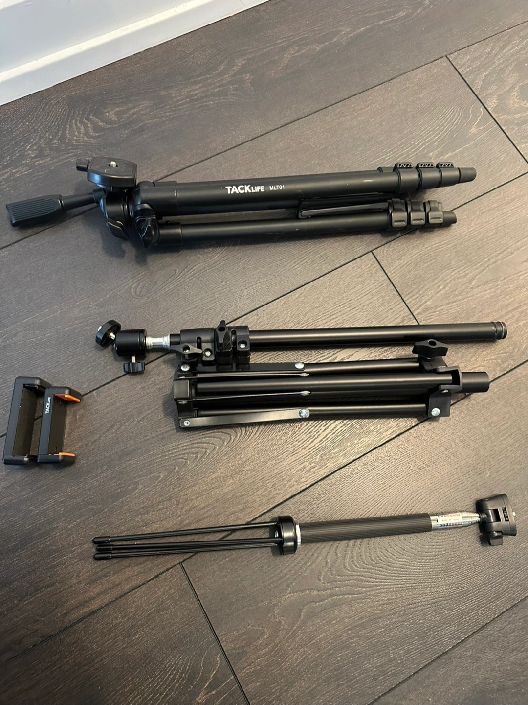 3 Tripods for sale. Could be used for camera, phone, or selfie lights (Lights not included).