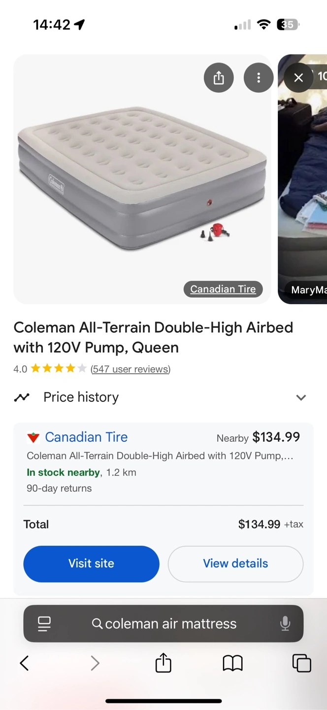 Selling a Coleman All-Terrain Double-High Airbed with 120V Pump, in queen size! It comes with its original bag. Originally bought for $134.99 + Taxes at Canadian Tire. Great for camping or guests!