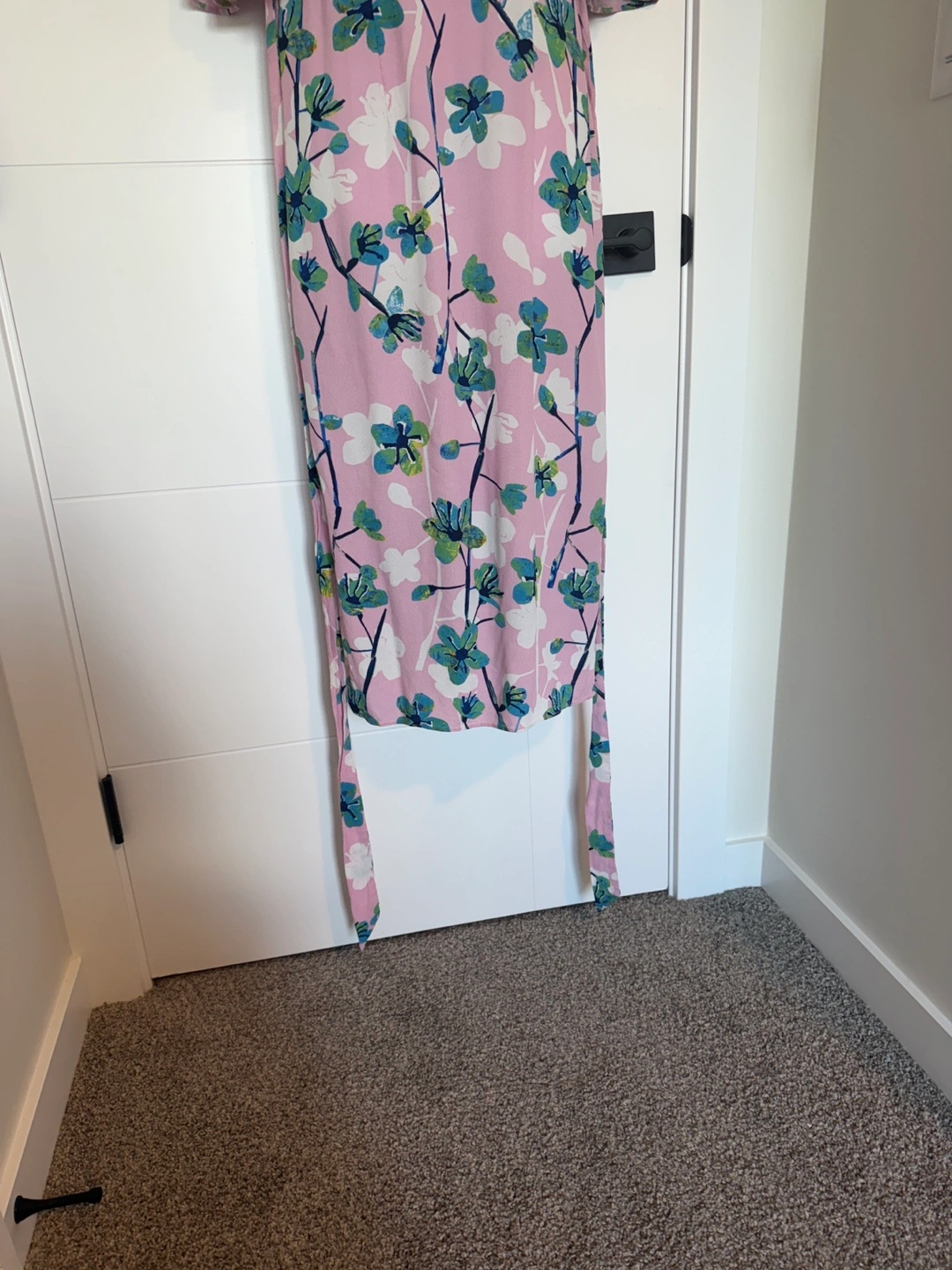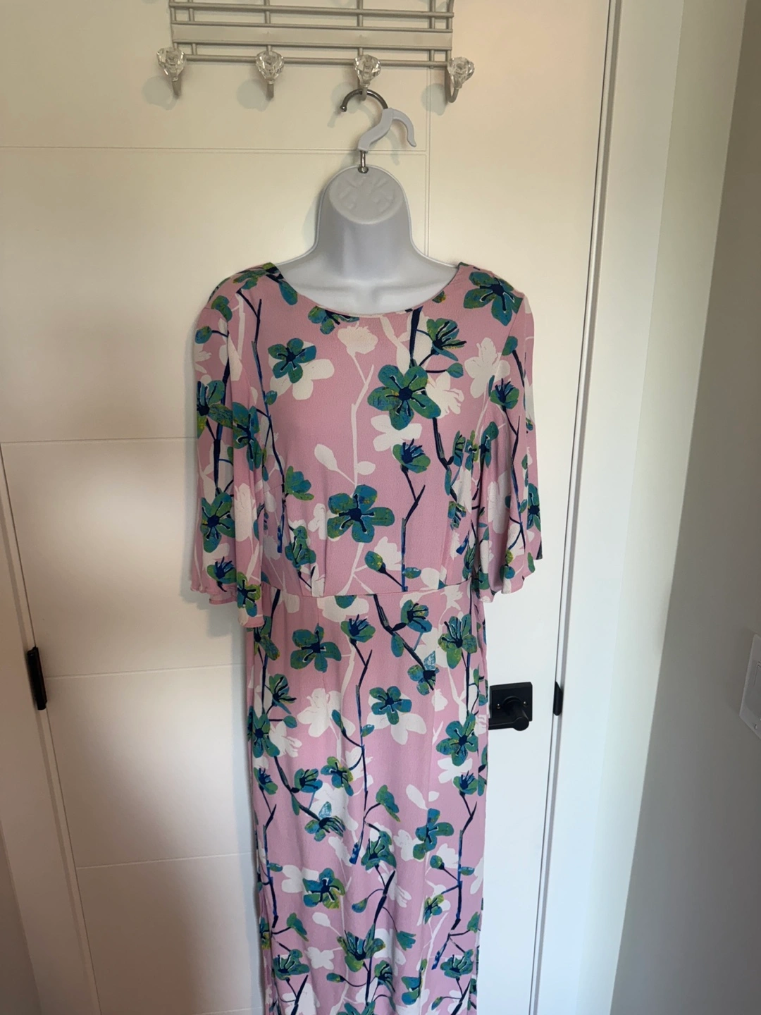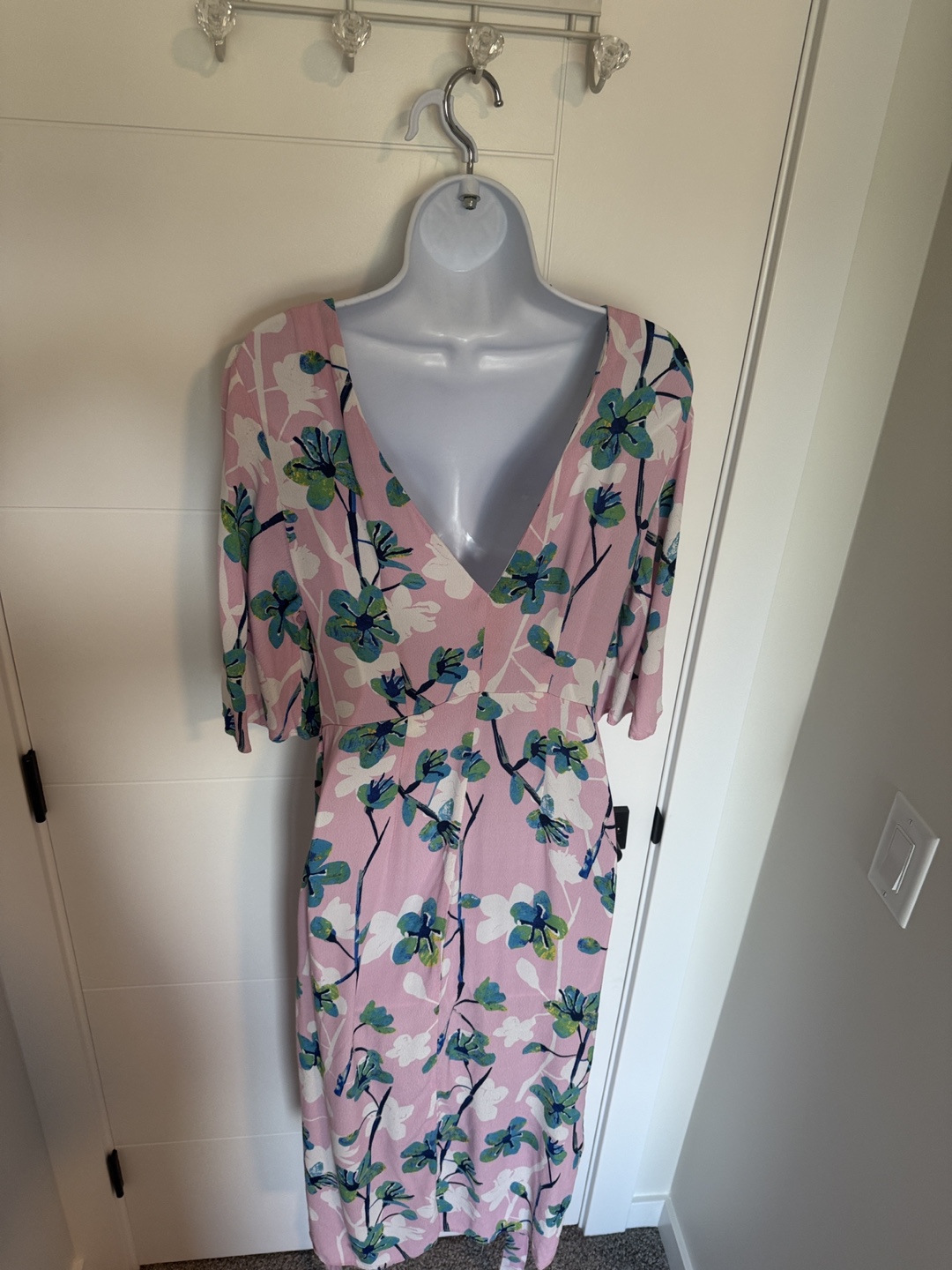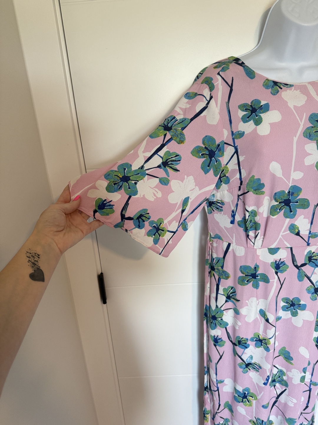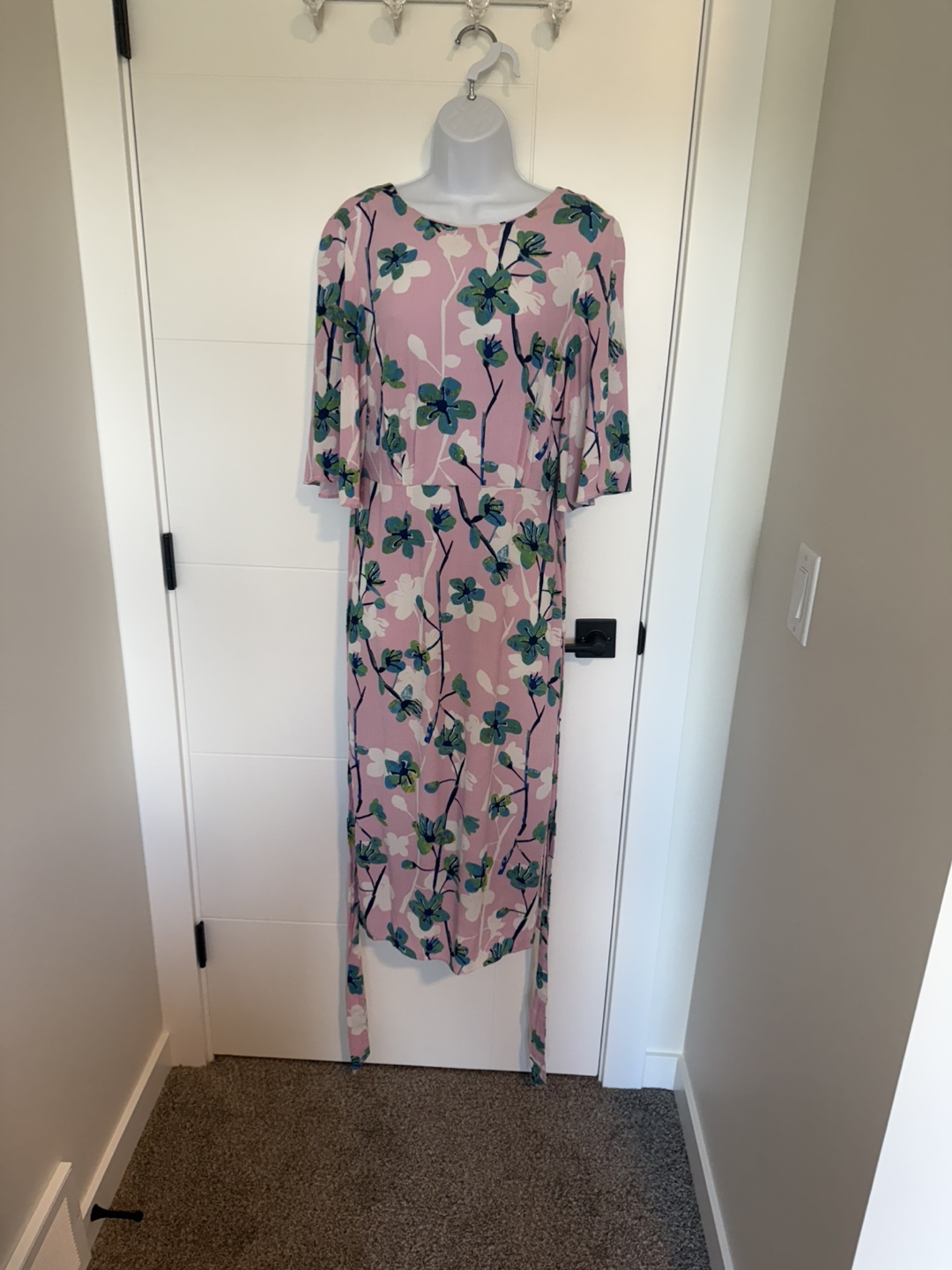 Calf-length dress in a crêpe weave with a V-neck at the back and short, wide sleeves. Concealed zip in one side, a seam at the waist with pleats and a tie belt, and a straight-cut skirt with slits in the sides. Unlined. Dress is in excellent condition, only worn once! Light pink with white and blue/green flowers Size 8 Measurements: 17 inches pit to pit, 46 inches long. Smoke free home Pick up in Wolf Willow SE