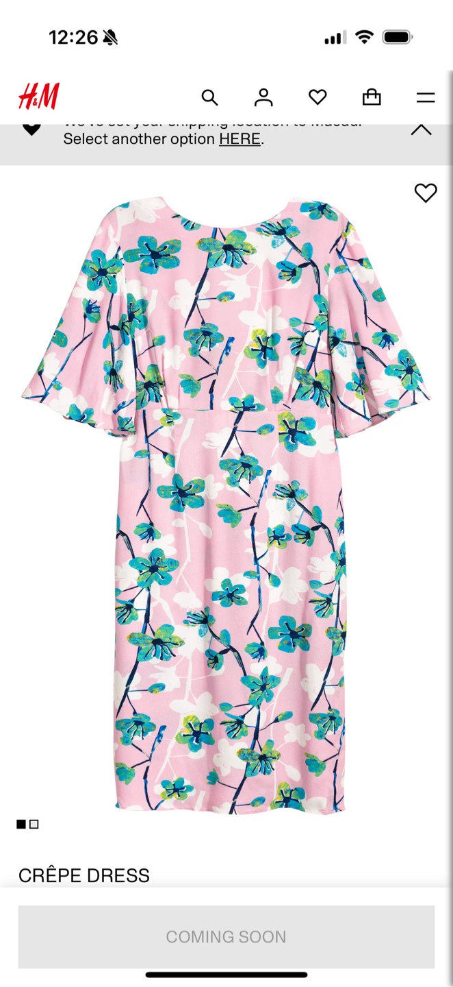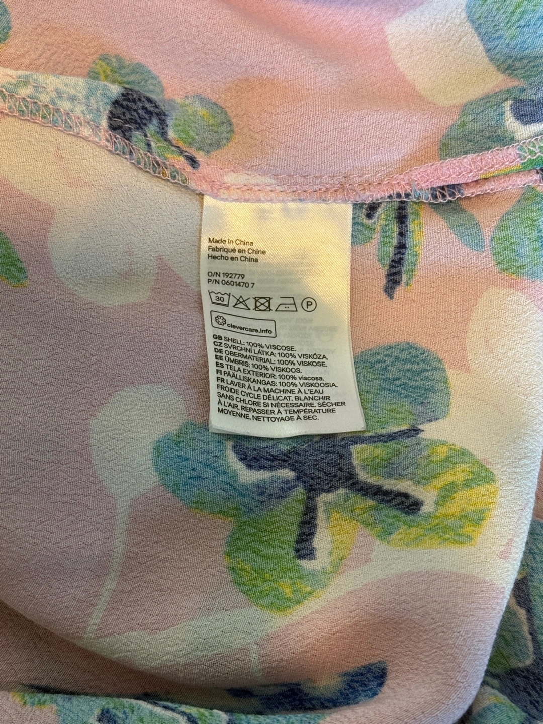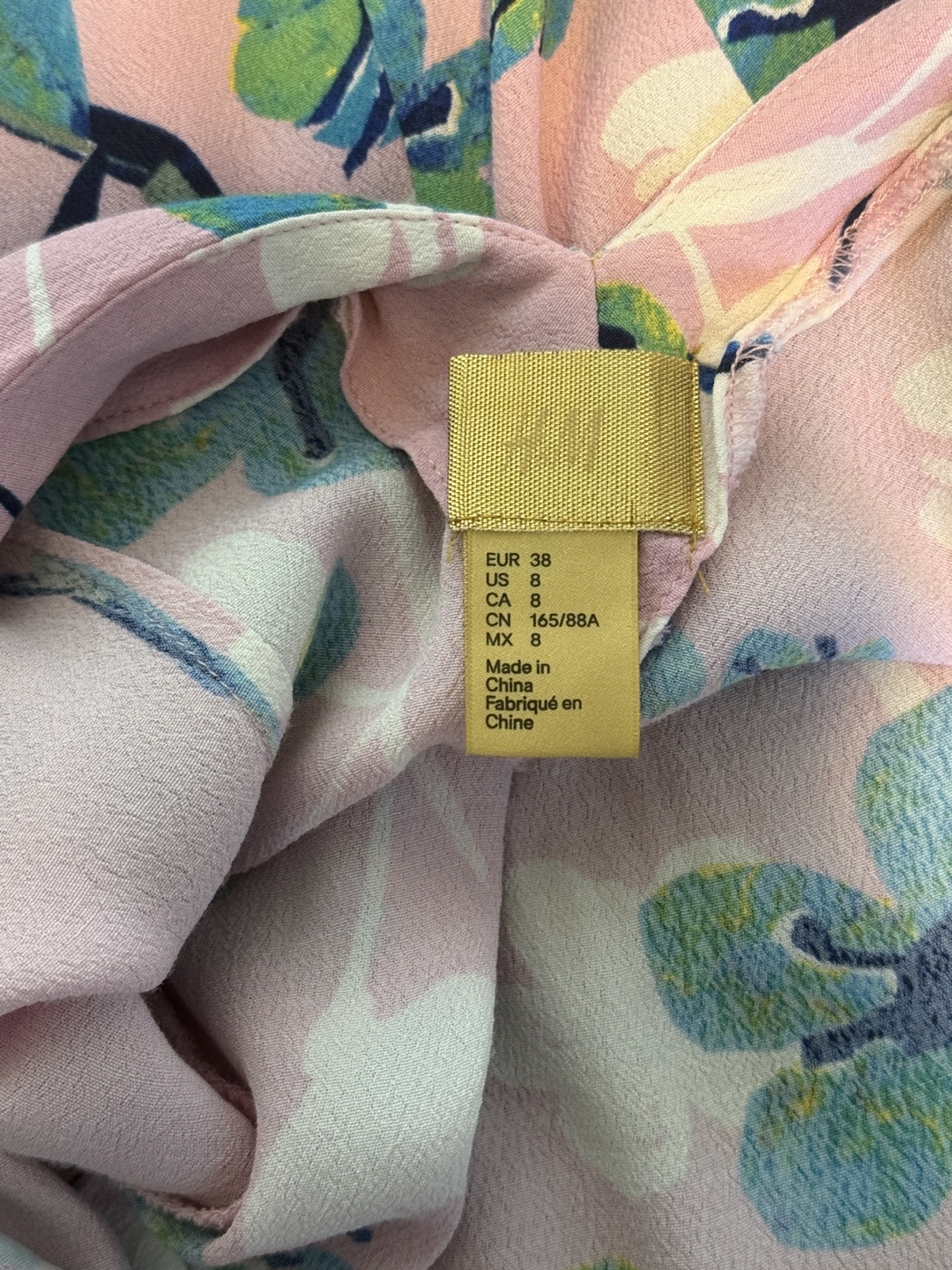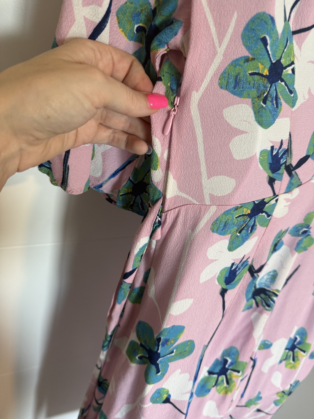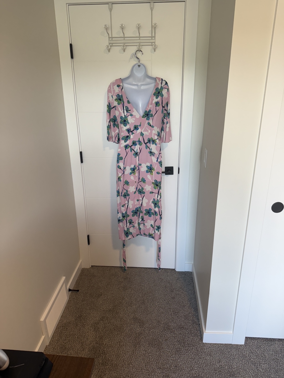 Calf-length dress in a crêpe weave with a V-neck at the back and short, wide sleeves. Concealed zip in one side, a seam at the waist with pleats and a tie belt, and a straight-cut skirt with slits in the sides. Unlined. Dress is in excellent condition, only worn once! Light pink with white and blue/green flowers Size 8 Measurements: 17 inches pit to pit, 46 inches long. Smoke free home Pick up in Wolf Willow SE