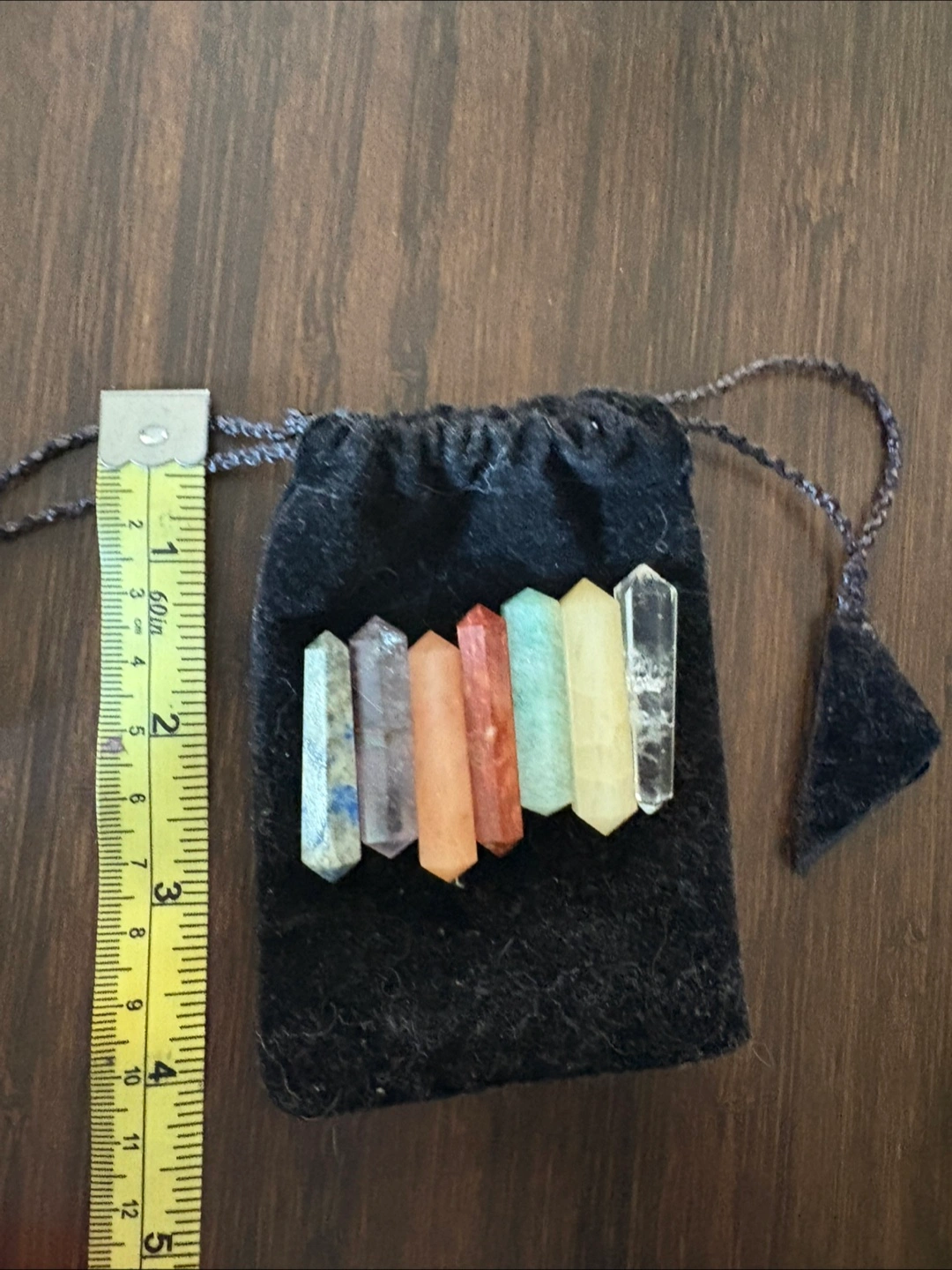 Selling a set of chakra crystals that comes with a handy black velvet bag. The set includes seven different crystals, each representing a different chakra. Perfect for meditation or energy work!