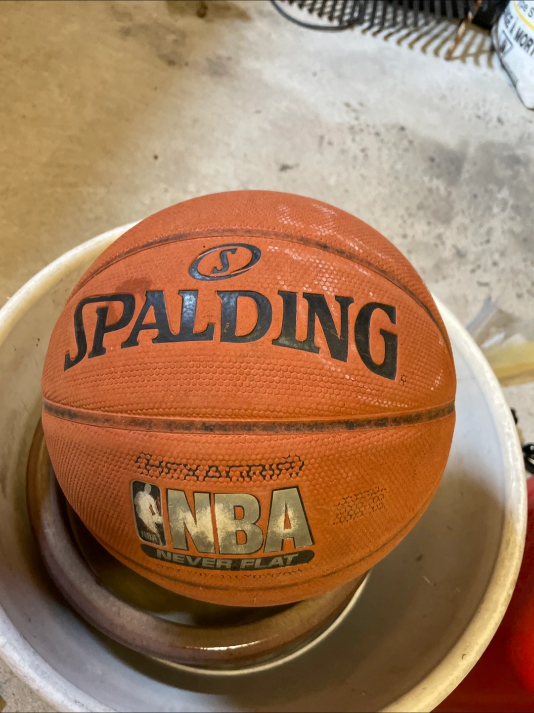 Selling a Spalding NBA Never Flat basketball. It's in used condition, with some signs of wear. Great for a casual game of hoops!