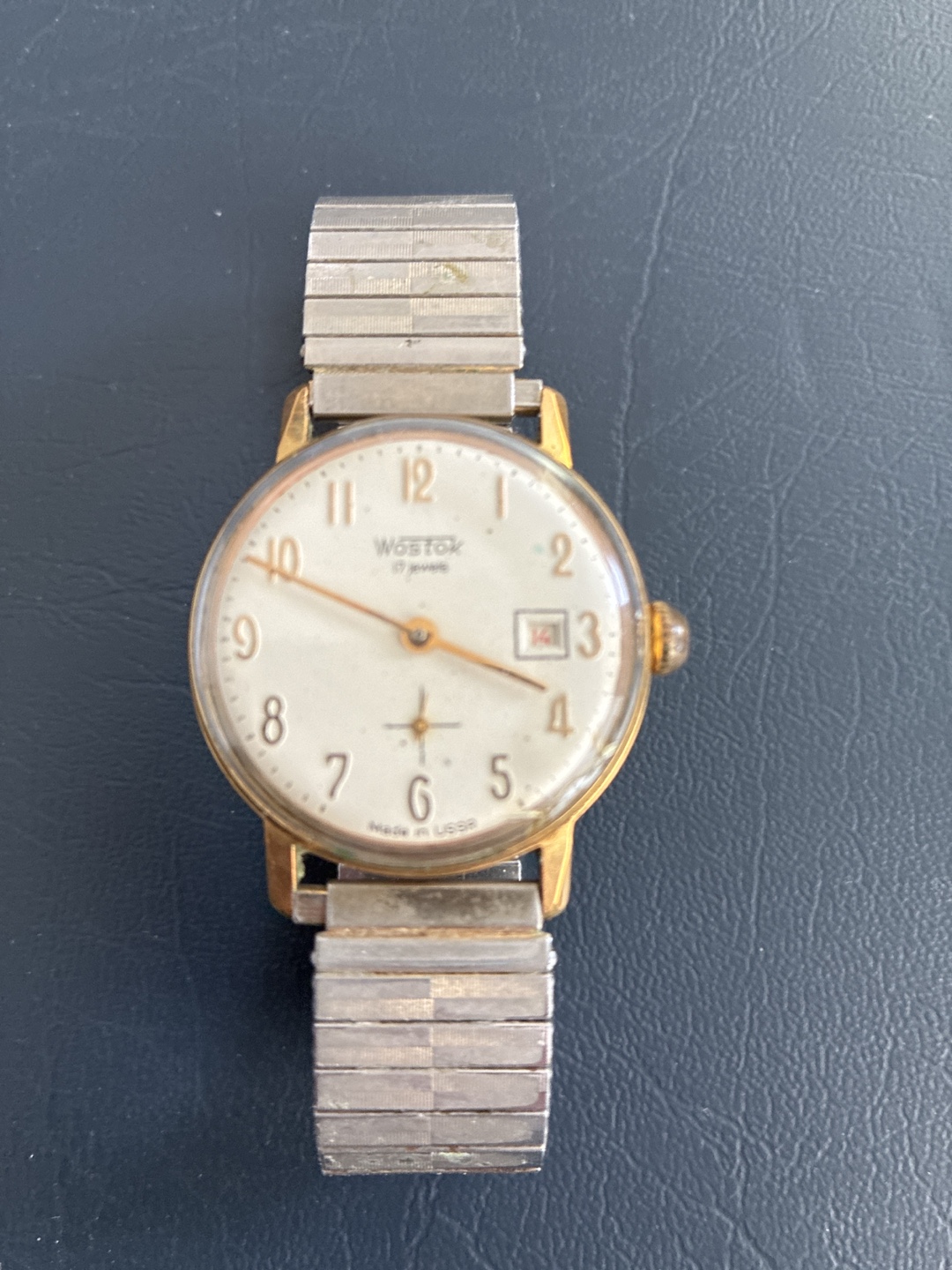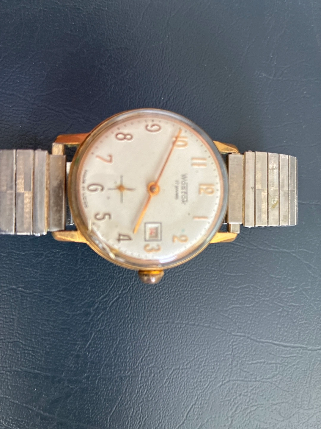 Selling a vintage Vostok watch with 17 jewels. It has a stainless steel back and is shock-resistant and dust-protected. The watch face has some wear, but it still tells time accurately. A cool piece of history! Glass has a crack and it is currently not functioning. Needs cleaning.