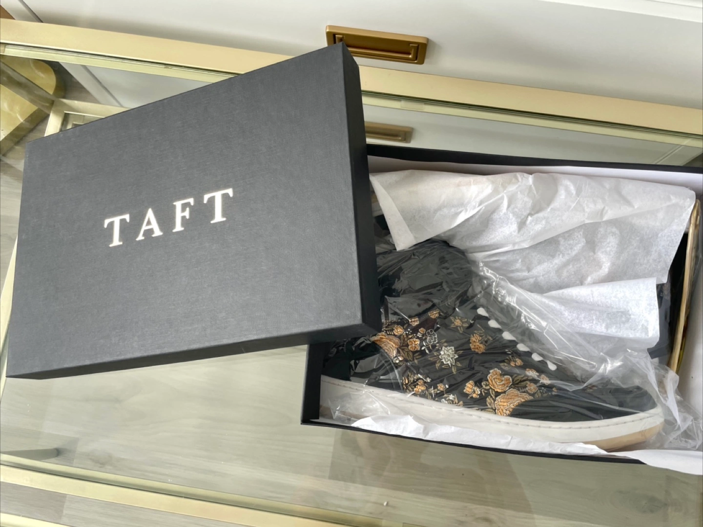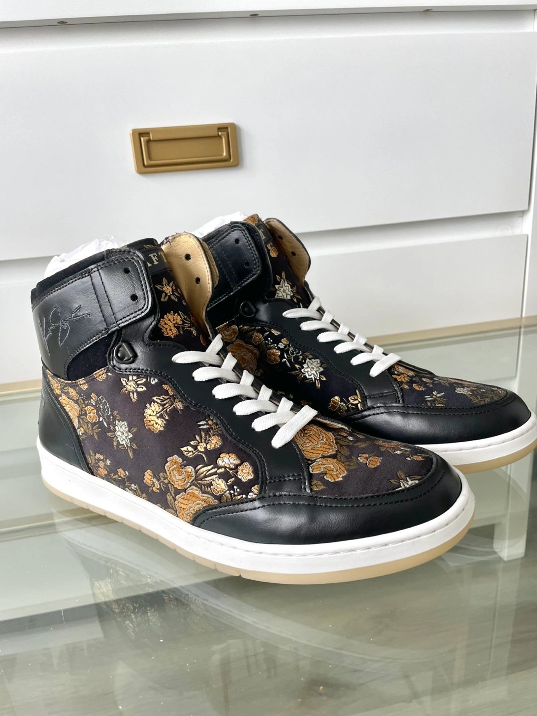 Selling a pair of Taft The Rapido high-top sneakers in Eden Noir, size US 10.5. These stylish sneakers come with their original box. Made in Spain, they feature a unique floral design on a black background. Perfect for adding a touch of flair to your wardrobe!