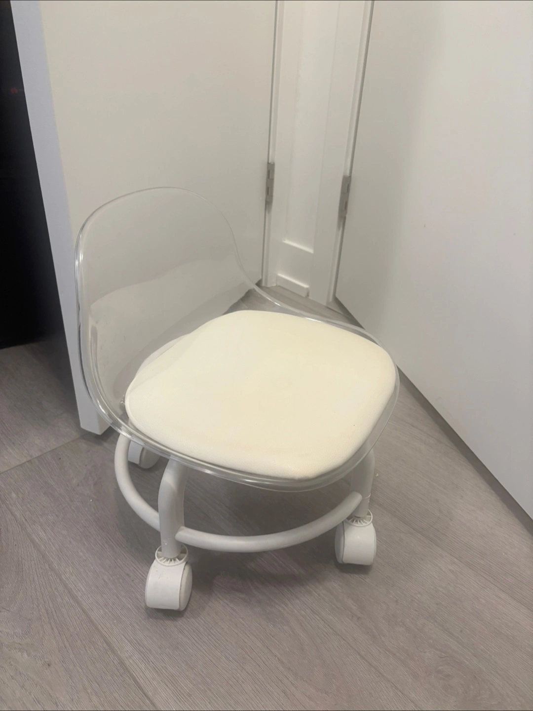 Selling a gently used rolling short chair. It features a clear acrylic back and a comfy white seat cushion. The base is white with rolling casters, perfect for home use.