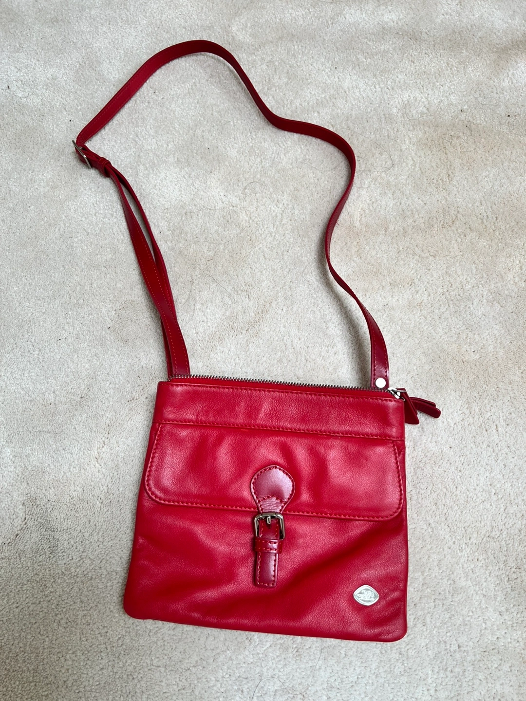 New red leather crossbody bag. It's perfect for everyday use and has plenty of room for your essentials. The bag has a zippered closure and an adjustable strap. It's ready for a new home, $40