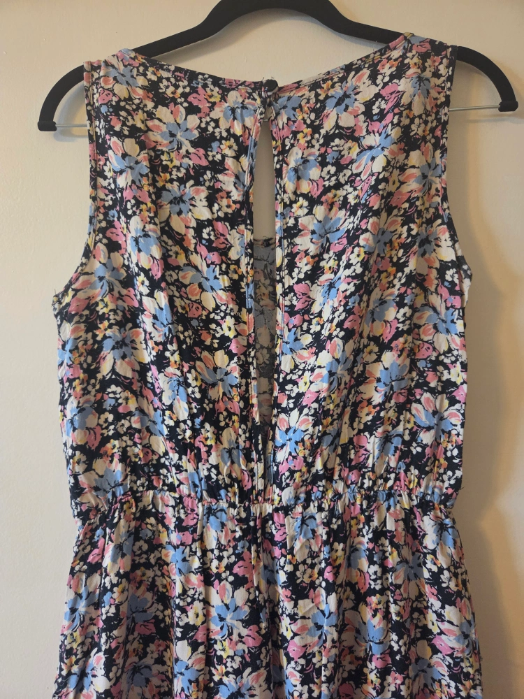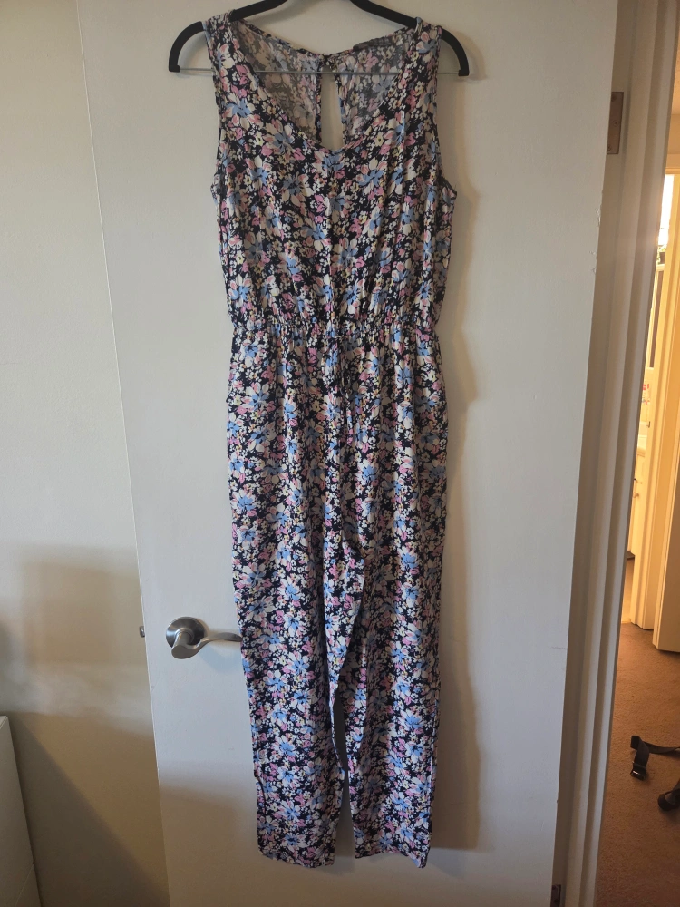 Floral print jumpsuit. Light material. Mix of pink, blue, and white flowers on a dark background. It has a comfortable elastic waistband with a drawstring and pockets on both sides. Open slit detail on back.