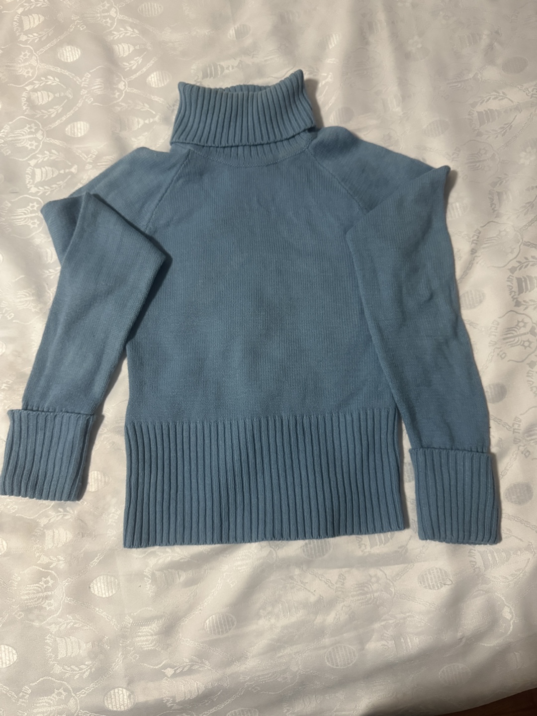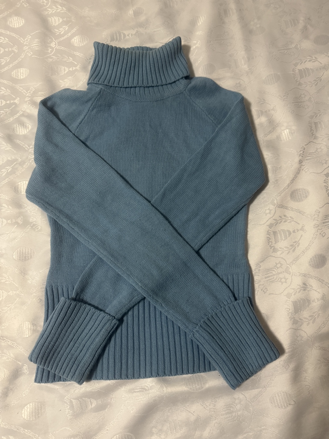 A cozy blue turtleneck sweater, perfect for chilly days! It's in great condition and ready for a new home. It's a stylish and practical piece for layering or wearing on its own. Porch pick up Cash only, Midland and Lawrence, Scarborough