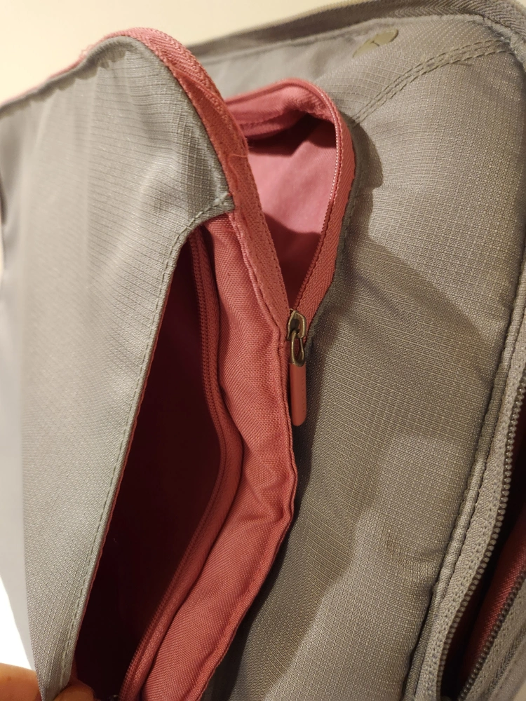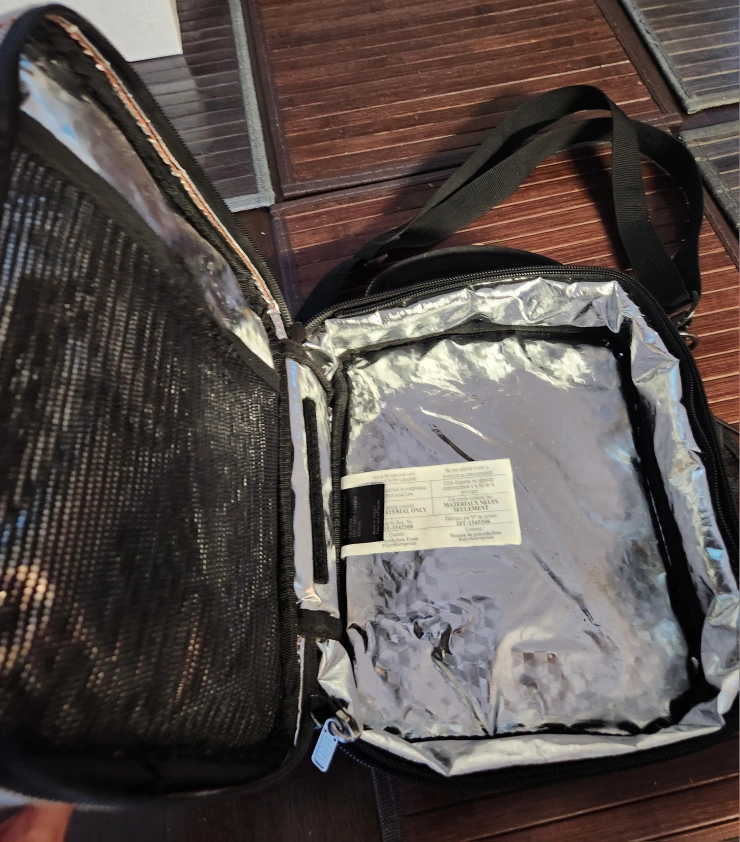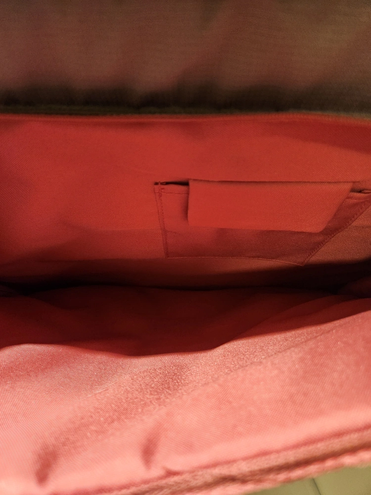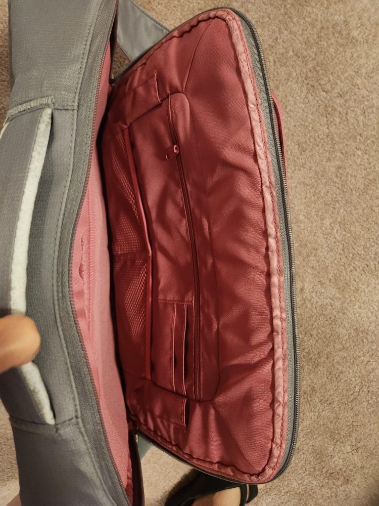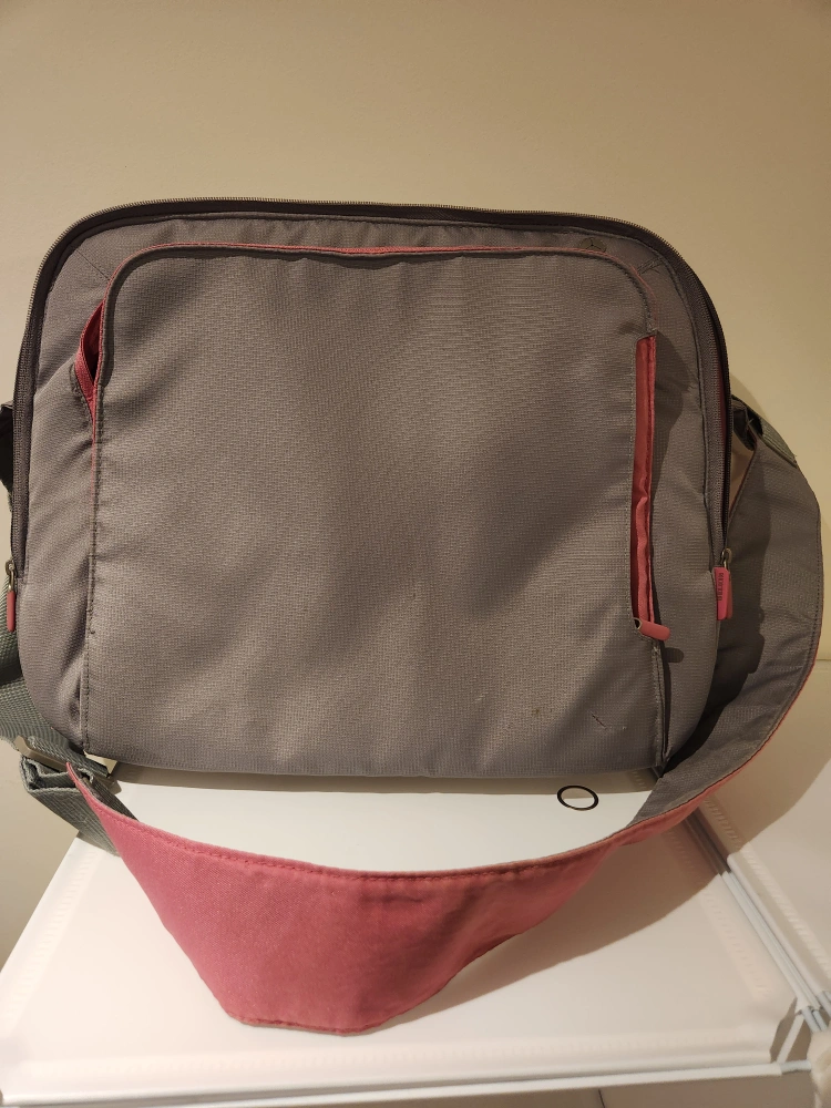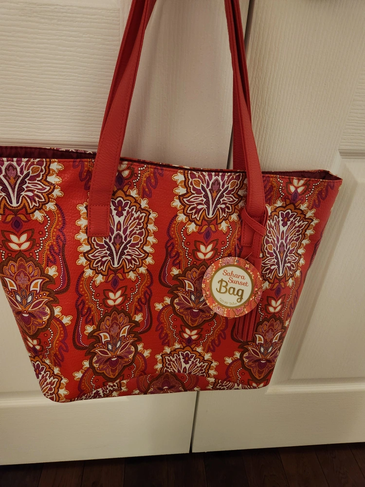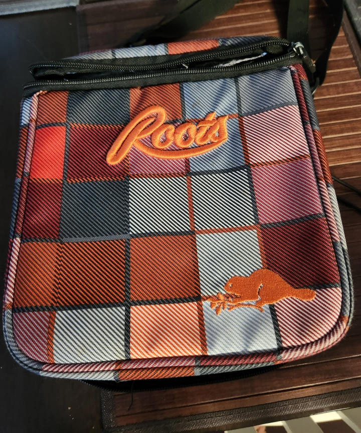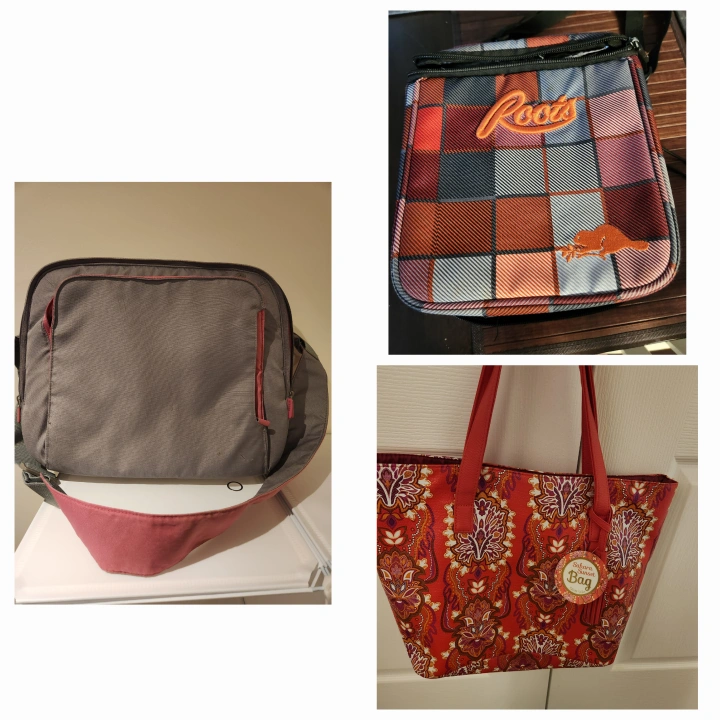 a collection of three stylish bags perfect for various needs. The first is a Roots lunch bag. Next, there's a versatile laptop bag with a shoulder strap and multiple compartments for organization. Lastly, a new Sahara tote bag (New) with a vibrant orange paisley design is great for shopping or everyday use.