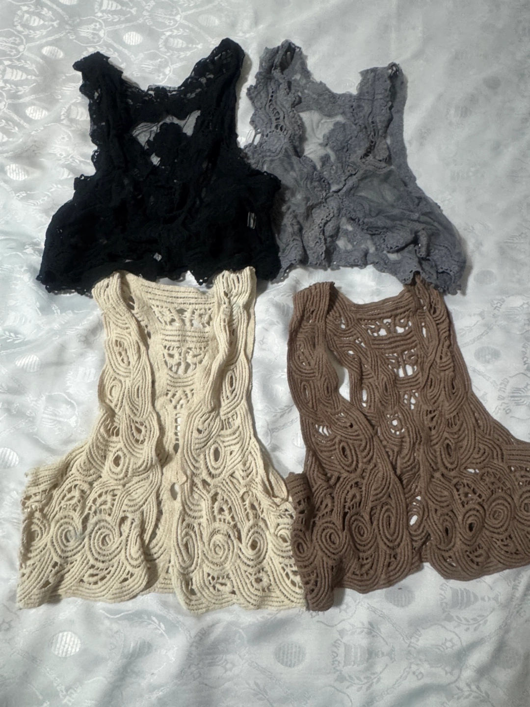 Selling a bundle of four crochet lace vests! Includes black, grey, beige, and brown. Great for layering or adding a unique touch to any outfit! Porch pick up Cash only, Midland and Lawrence, Scarborough