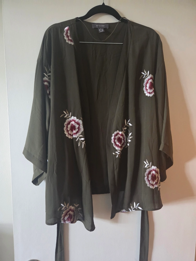 Buy & SellPrimark Olive Green Floral KimonoPrimark Olive Green Floral Kimono$8Primark kimono in olive green! It features beautiful floral embroidery and a tie waist. Loose half length sleeves. In great condition ConditionLike newSizeUK Size 12/14 (8/10)WHERE TO MEETCheck LocationView MapSELLERverifiedElaineFairview1003 reviews0 chats·0 favorites·8 views