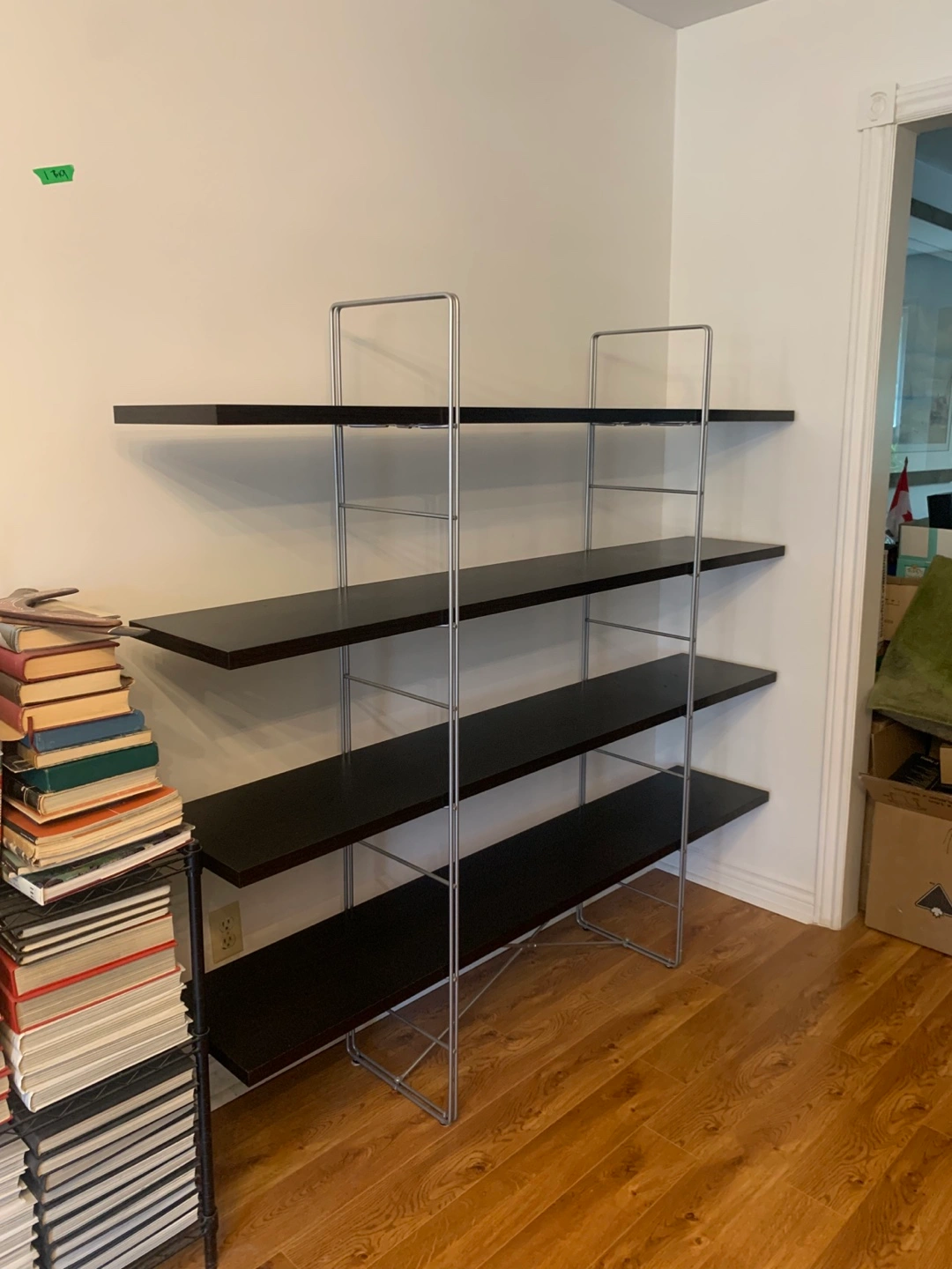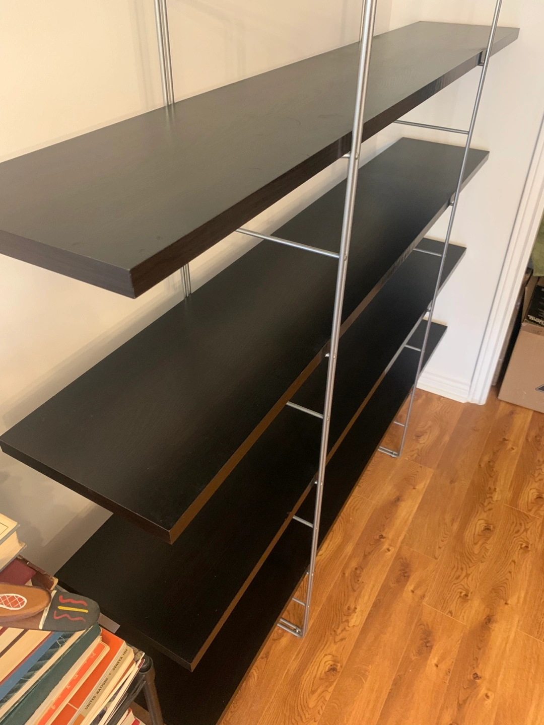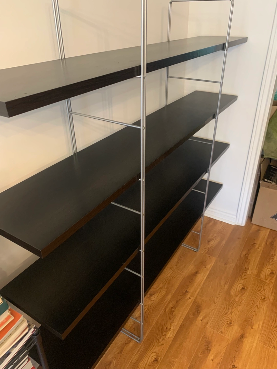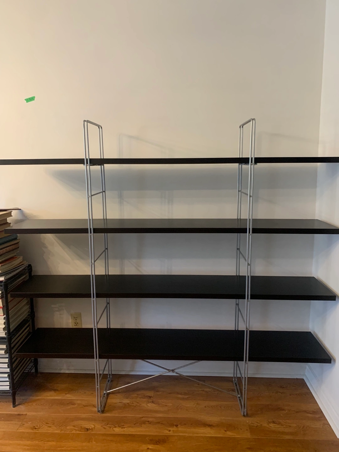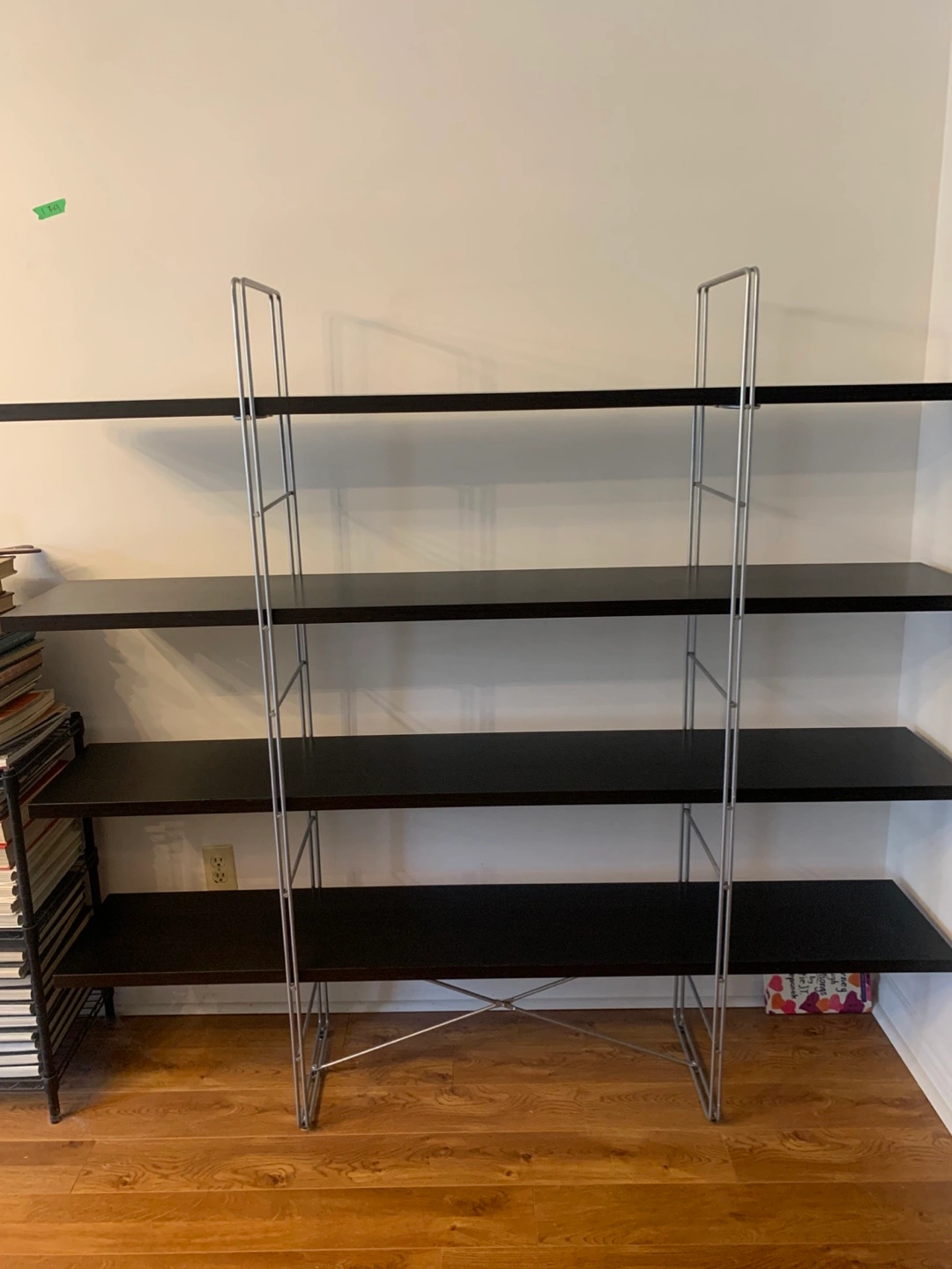 Selling an open IKEA shelving unit with an espresso finish. It has four shelves and a silver metal frame. Great for organizing books or displaying items in your home. It has a few scratches, and one small chip ( not visible, covered with furniture marker), otherwise, in good shape. It’s 62 inches tall, 67 inches wide, and 12 inches deep. The top shelf is at 55 inches.