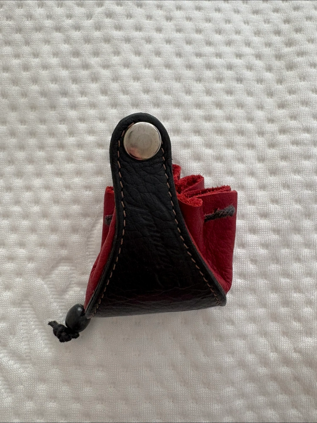 A cute little leather coin pouch! It's red and black and in great condition. Perfect for keeping your change organized.