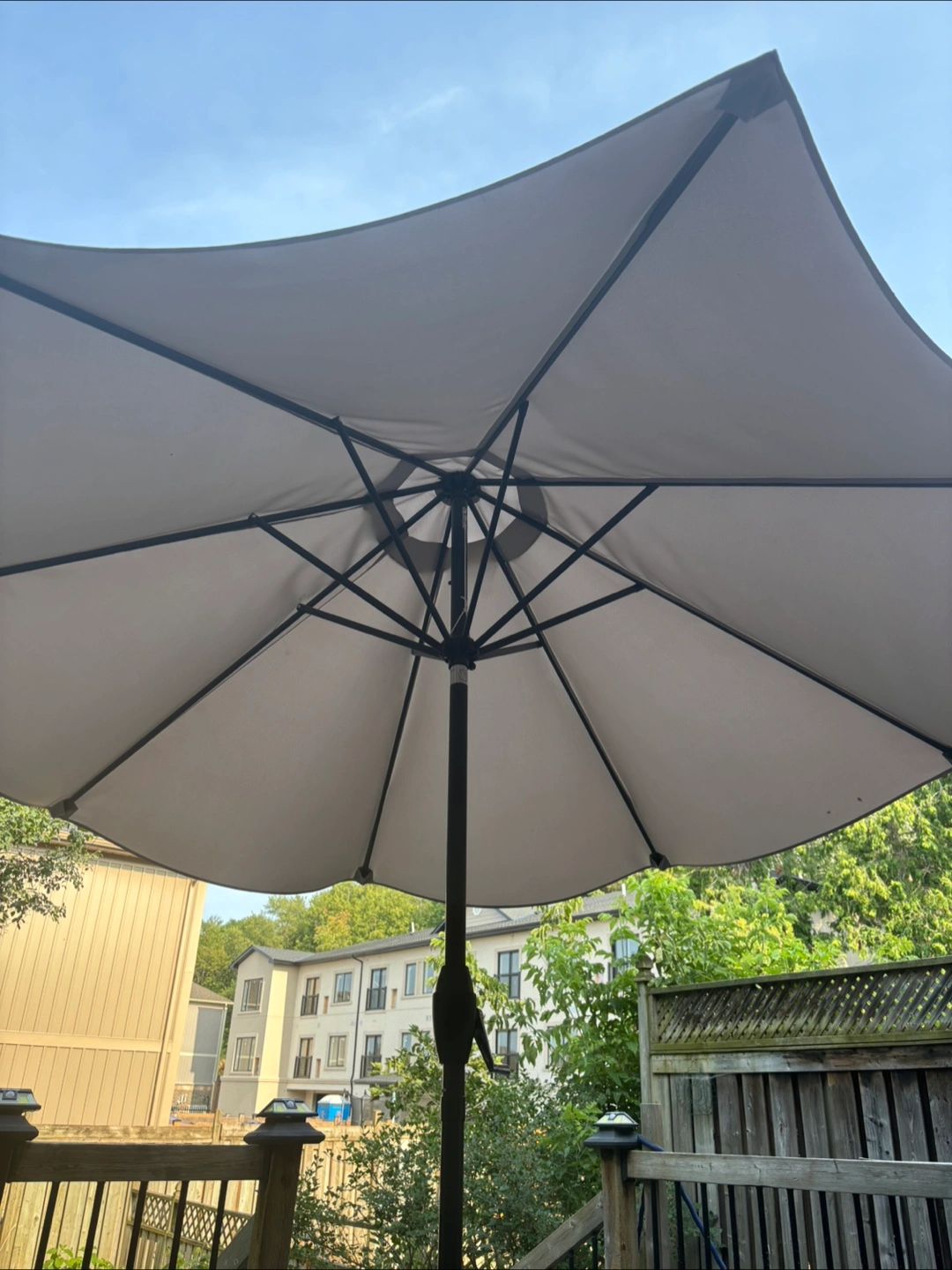 Had this umbrella 2 year, barely used. Base is ornate black iron and very secure so no wind issues or tipping over. In perfect condition.