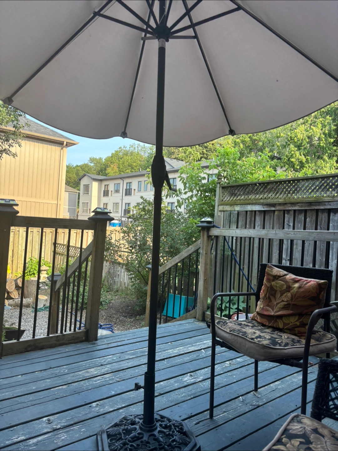 Patio umbrella with vintage wrought iron base