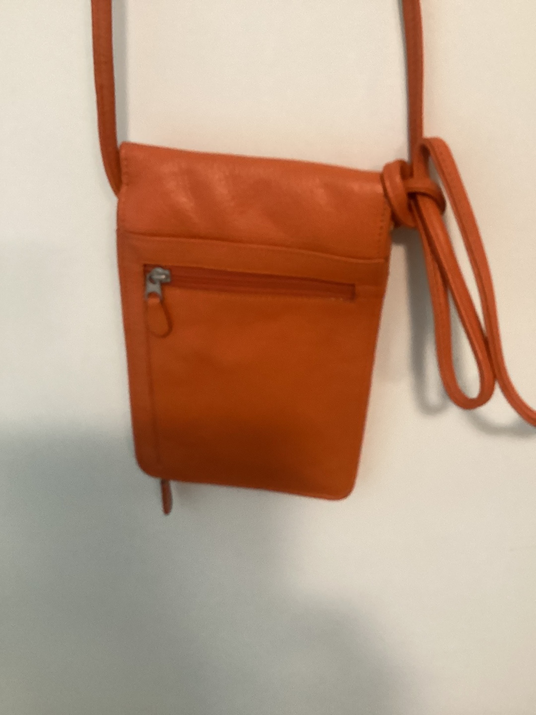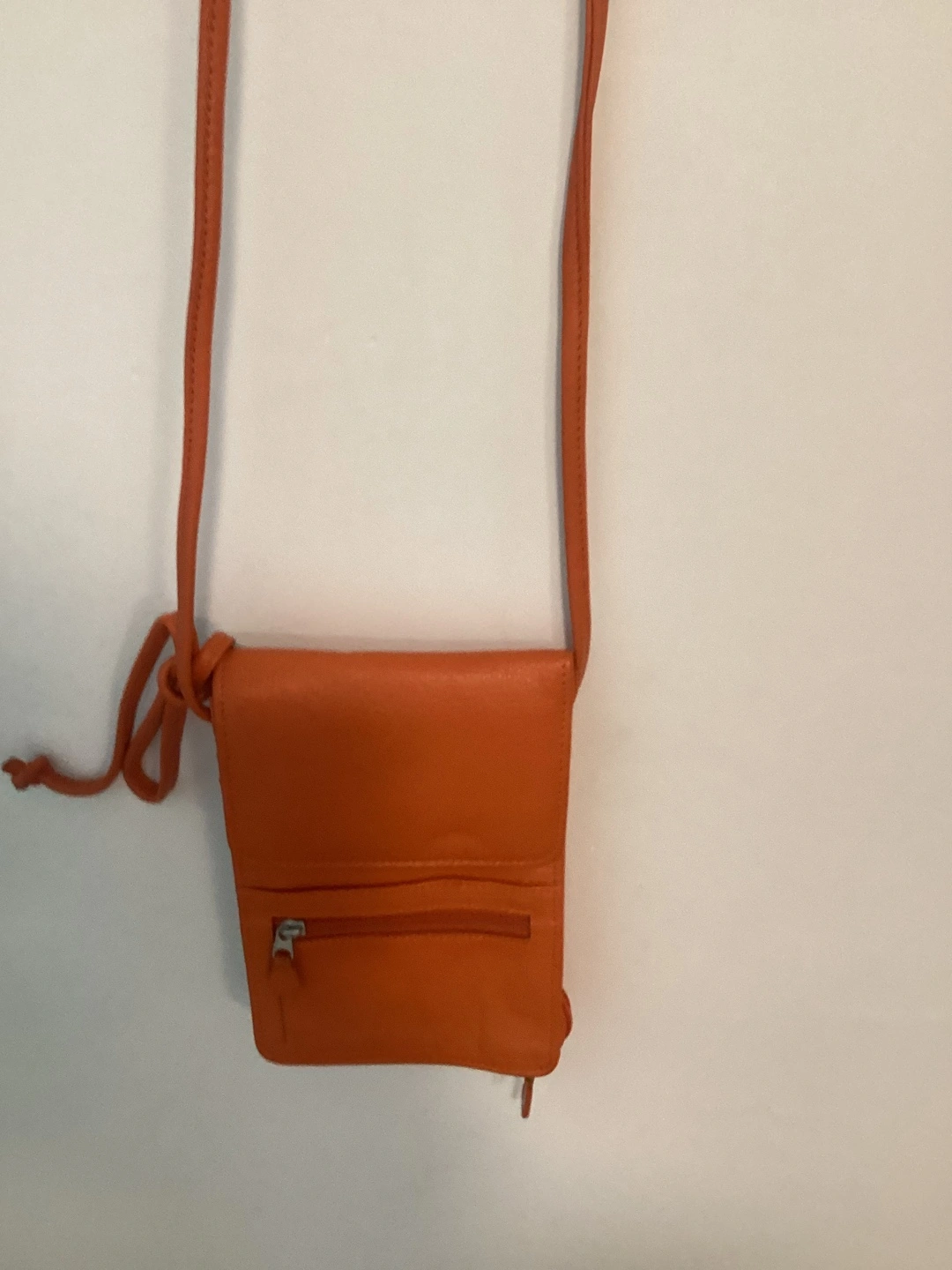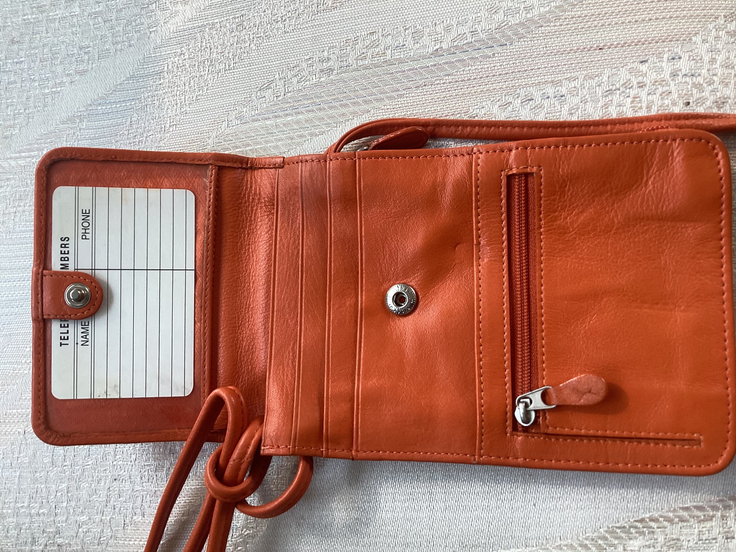 This is a Tres Chic Houston leather crossbody organizer in orange! It features a leather organizer on a string with RFID blocking lining. The strap can be knotted inside and shortened to any length. Retails for $52 US