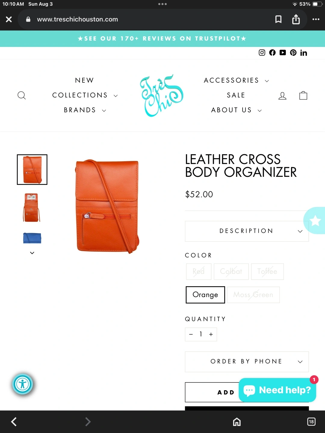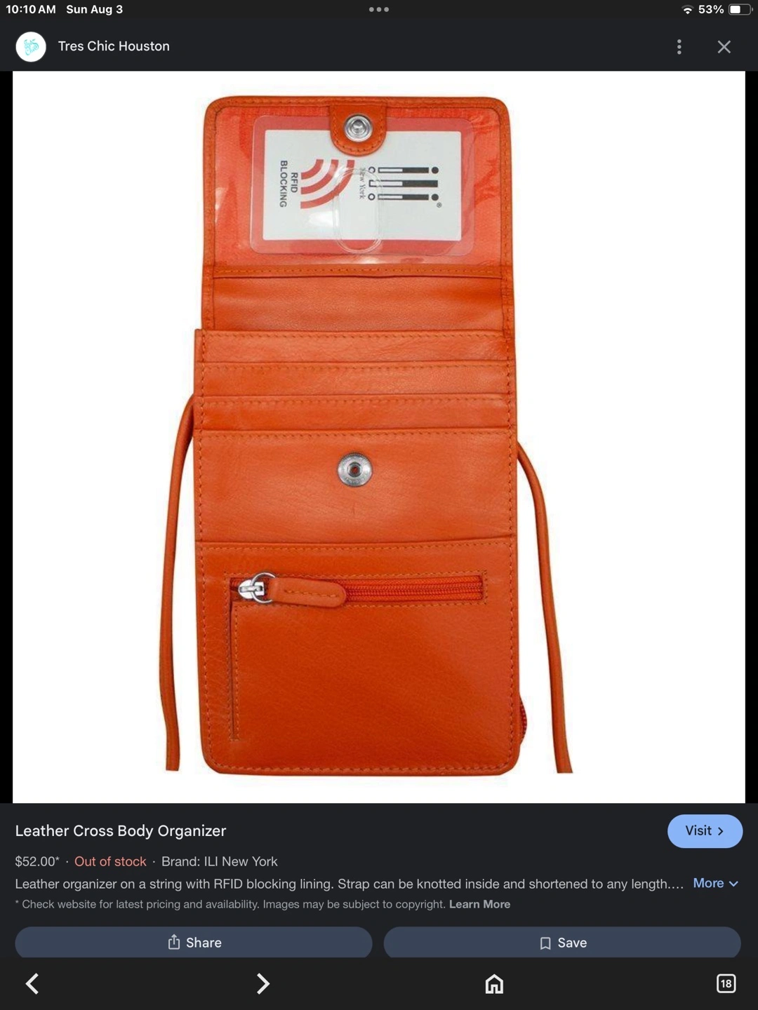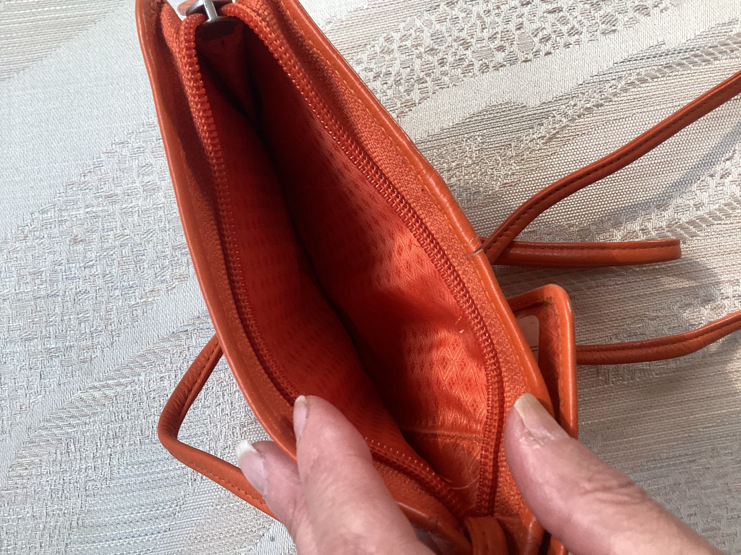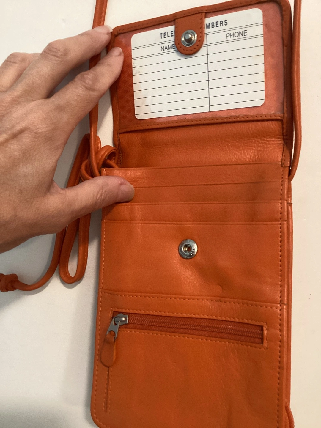 This is a Tres Chic Houston leather crossbody organizer in orange! It features a leather organizer on a string with RFID blocking lining. The strap can be knotted inside and shortened to any length. Retails for $52 US