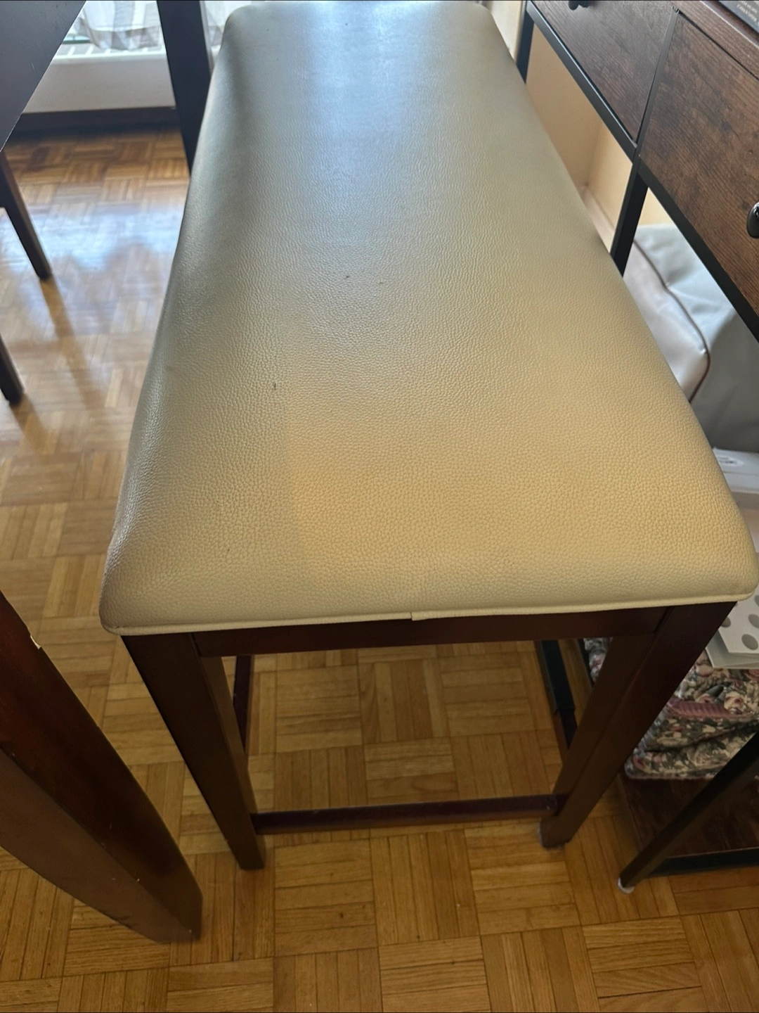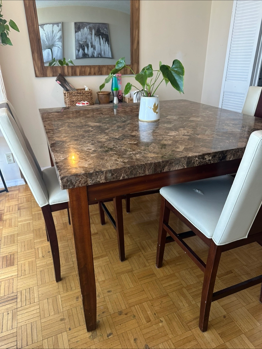Five-piece dining set includes one table with a marble-look top, three chairs and one bench. The table measures 54”Lx54”Wx3’H and has dark brown wood legs and frame. The chairs feature off-white vinyl seats and backs. Minor wear and tear. As shown in pictures I’m asking $180 firm.