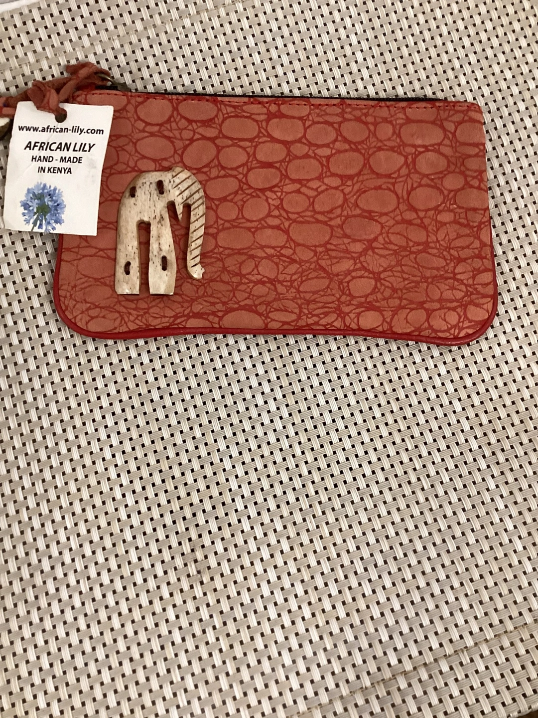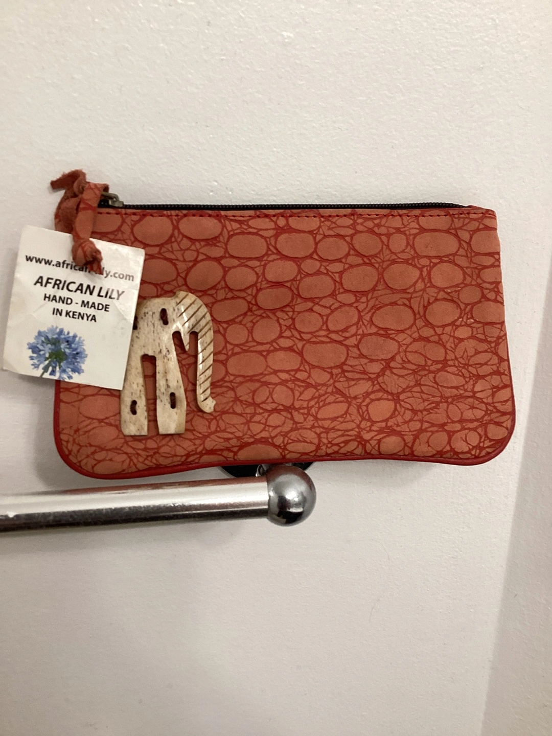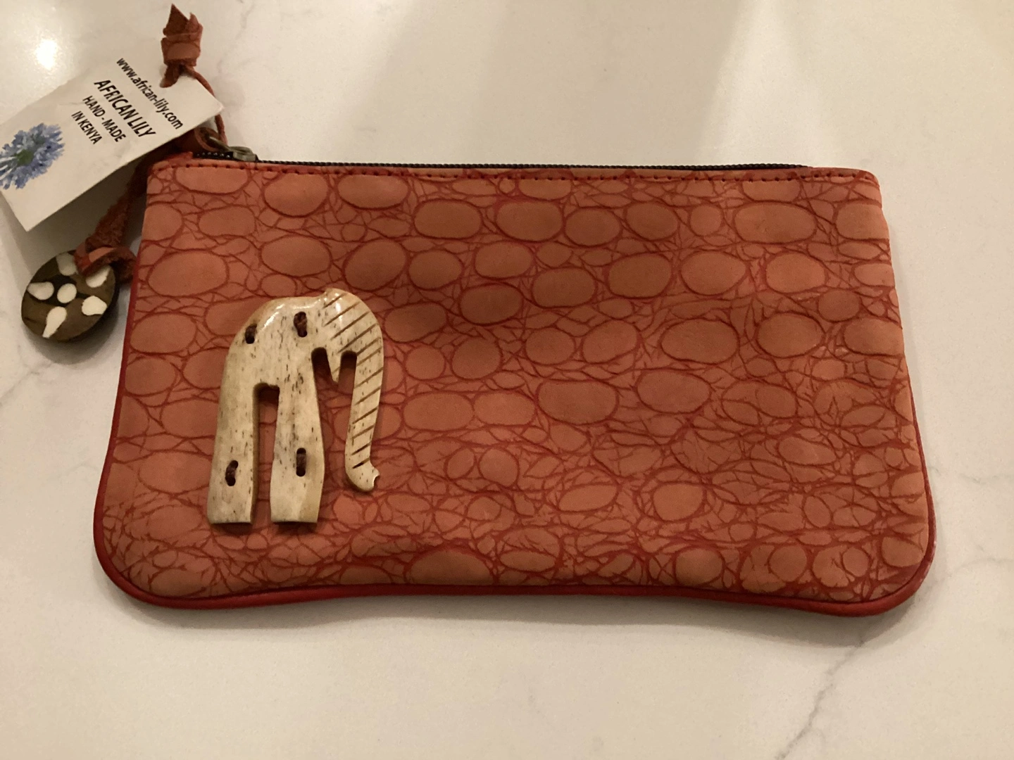 This is a cute, handmade pouch from African Lily! It's a unique piece with a fun pattern and an adorable elephant detail. The inside has a colourful striped lining.