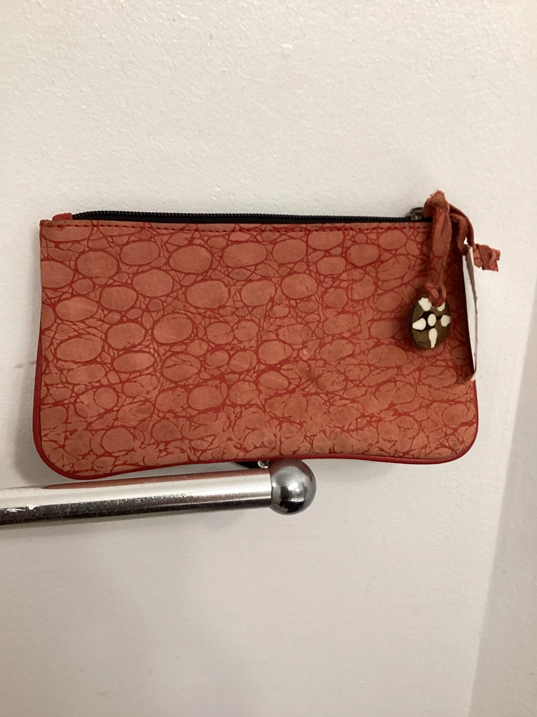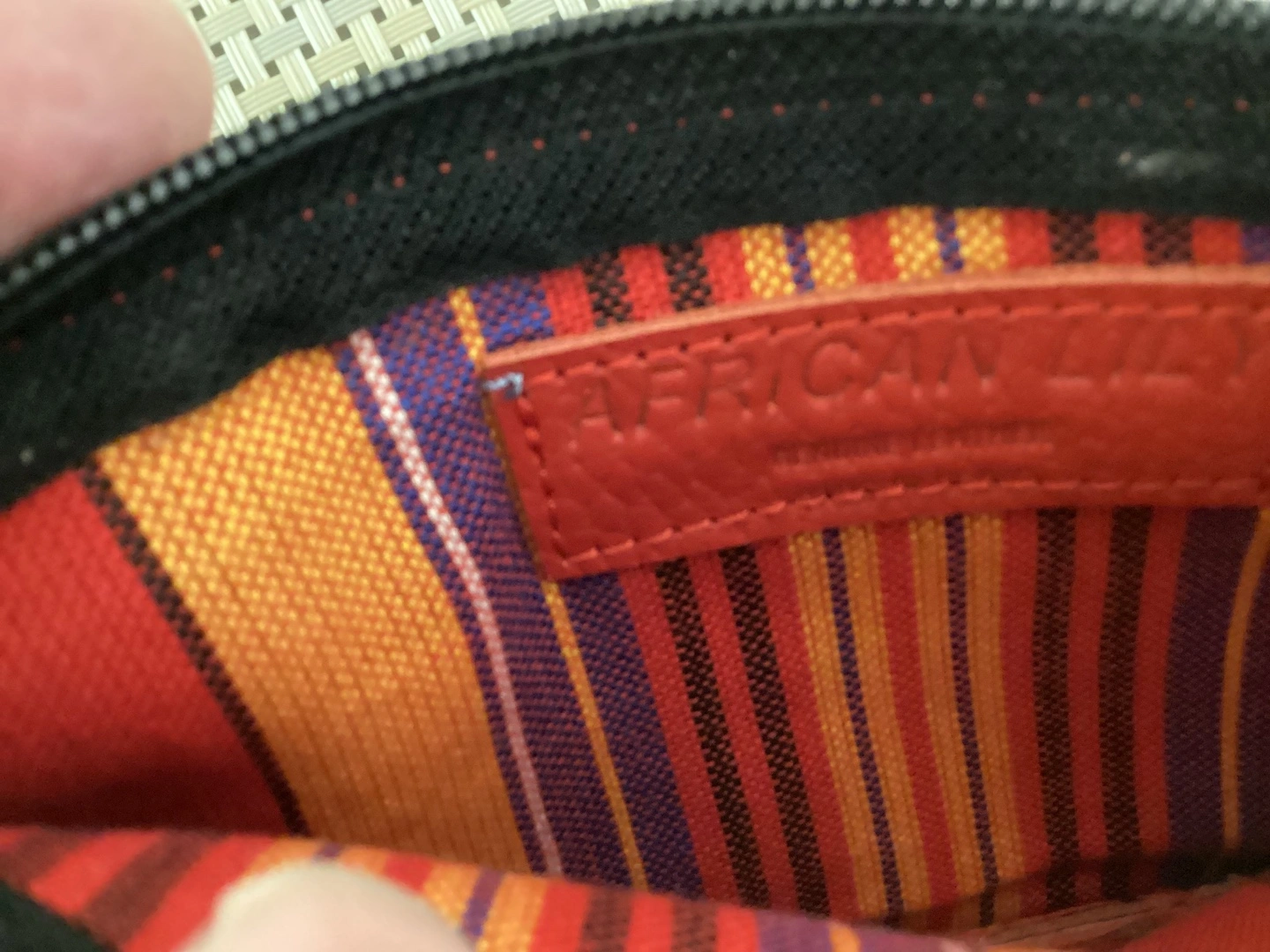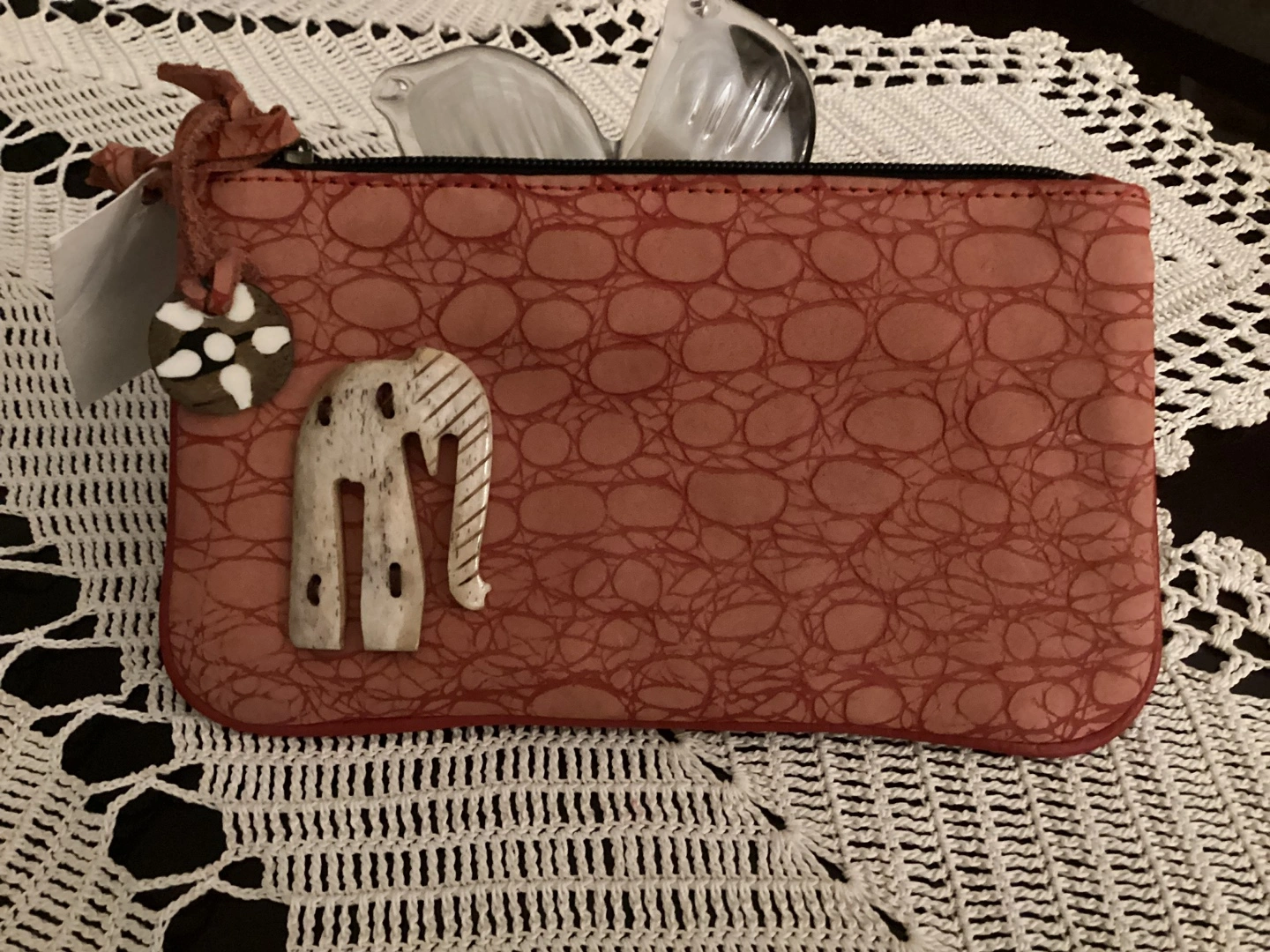 This is a cute, handmade pouch from African Lily! It's a unique piece with a fun pattern and an adorable elephant detail. The inside has a colourful striped lining.